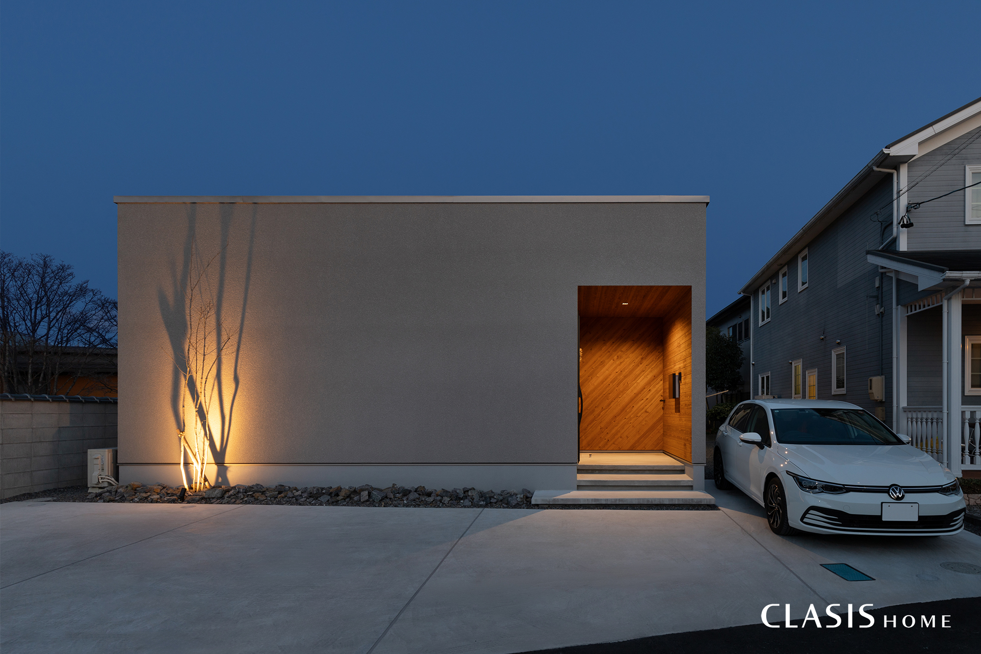 夜になると昼間とは一変して、幻想的な表情を見せる外観。計算されたライティングによって、塗り壁の陰影や天然木の豊かな質感がドラマチックに浮かび上がります。