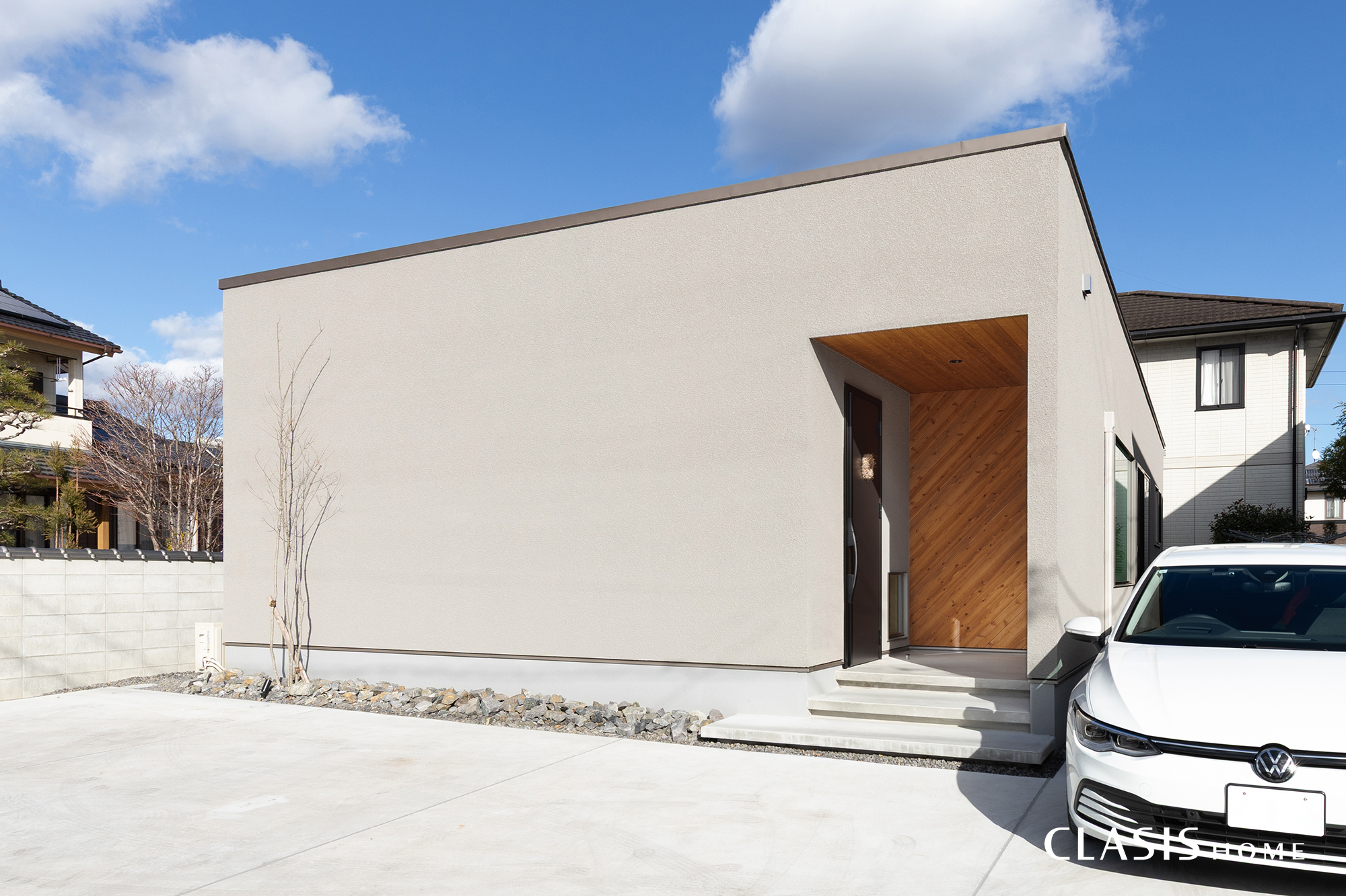 道路に面した正面はあえて窓を設けずシンプルな構成とすることで、玄関周りに施した天然木の質感をより一層際立たせています。