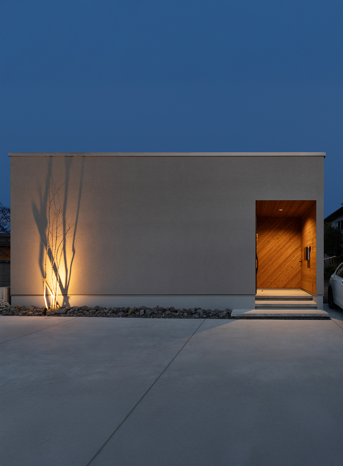 夜になると昼間とは一変して、幻想的な表情を見せる外観。計算されたライティングによって、塗り壁の陰影や天然木の豊かな質感がドラマチックに浮かび上がります。