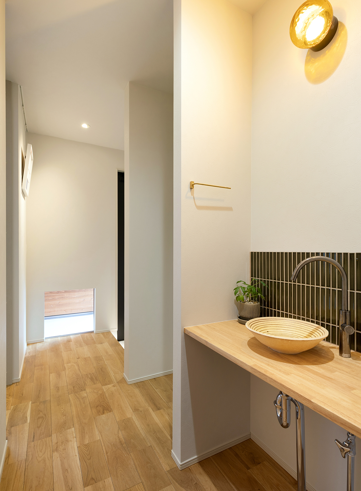 玄関の一角に設けた造作手洗い。タイルと焼き物のボウルを組み合わせ、落ち着きのある和の雰囲気に仕上げました。レトロなトグルスイッチを採用し、空間を引き立てるアクセントに。帰宅後すぐに使える利便性も備えています。