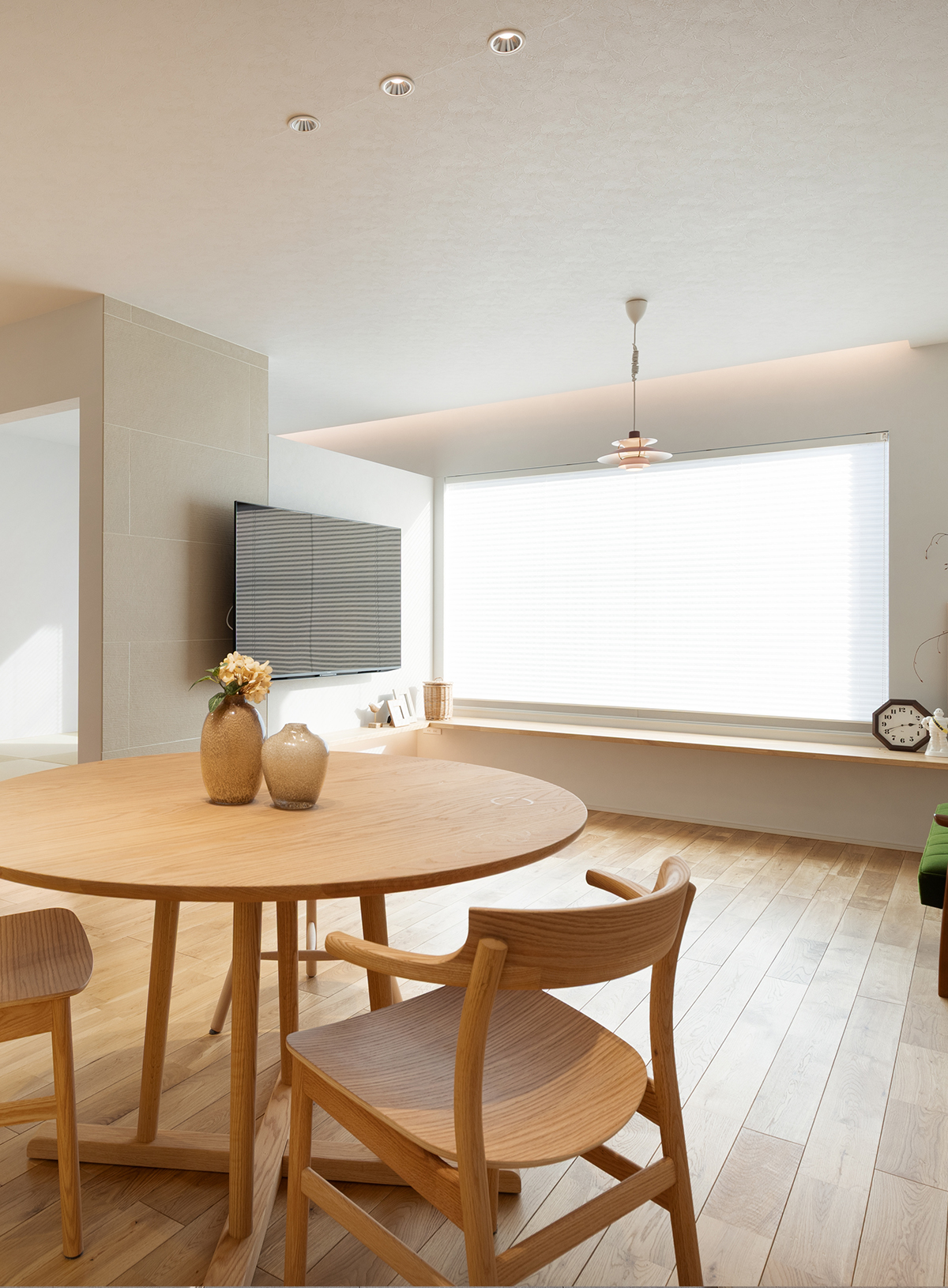 テレビ下から窓際へと続く造作カウンターは、腰掛けられるベンチとしても活躍します。テレビ下部のカウンターとラインを繋げることで、視覚的な一体感を演出しました。
