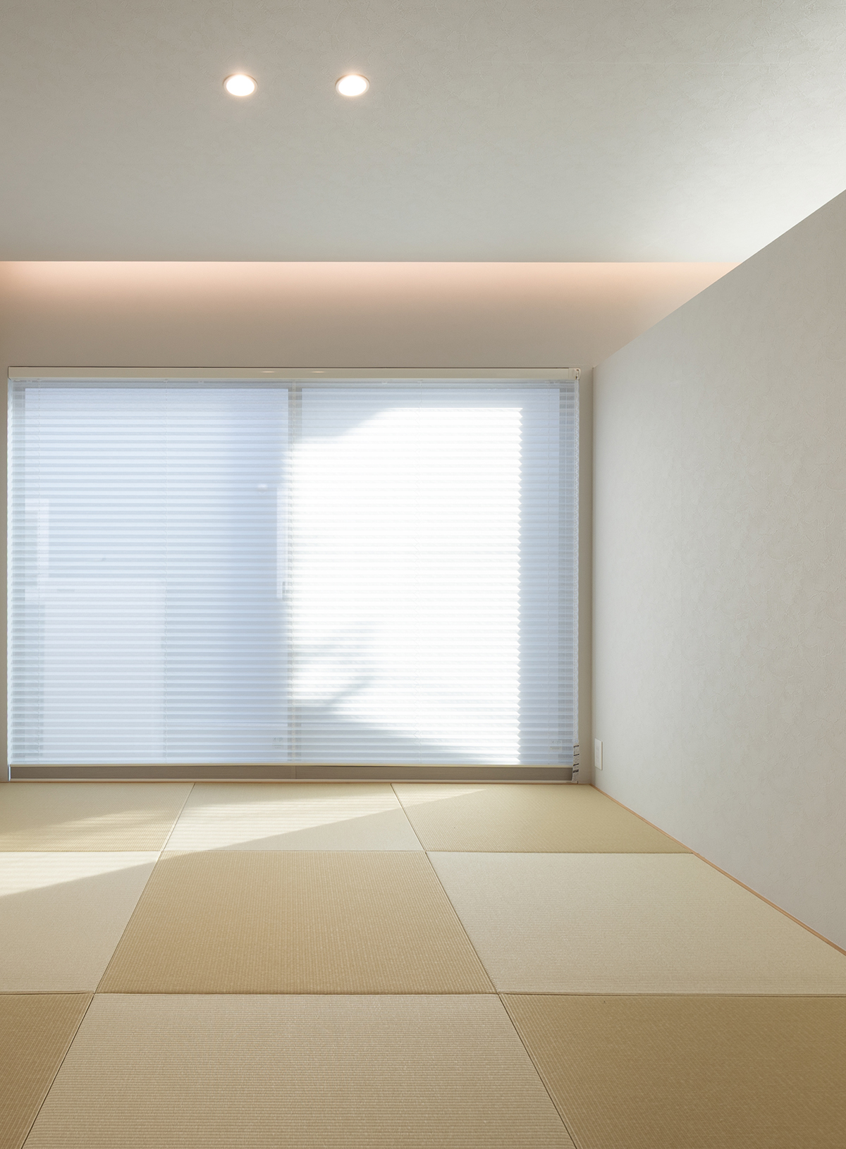 リビングに隣接する小上がり和室は、腰掛けたりお子様が遊んだりと多目的に使える空間。リビングとの間仕切り壁の上部を開放することで、日当たりや風通しを確保し、エアコンの効率も高めるよう設計しました。