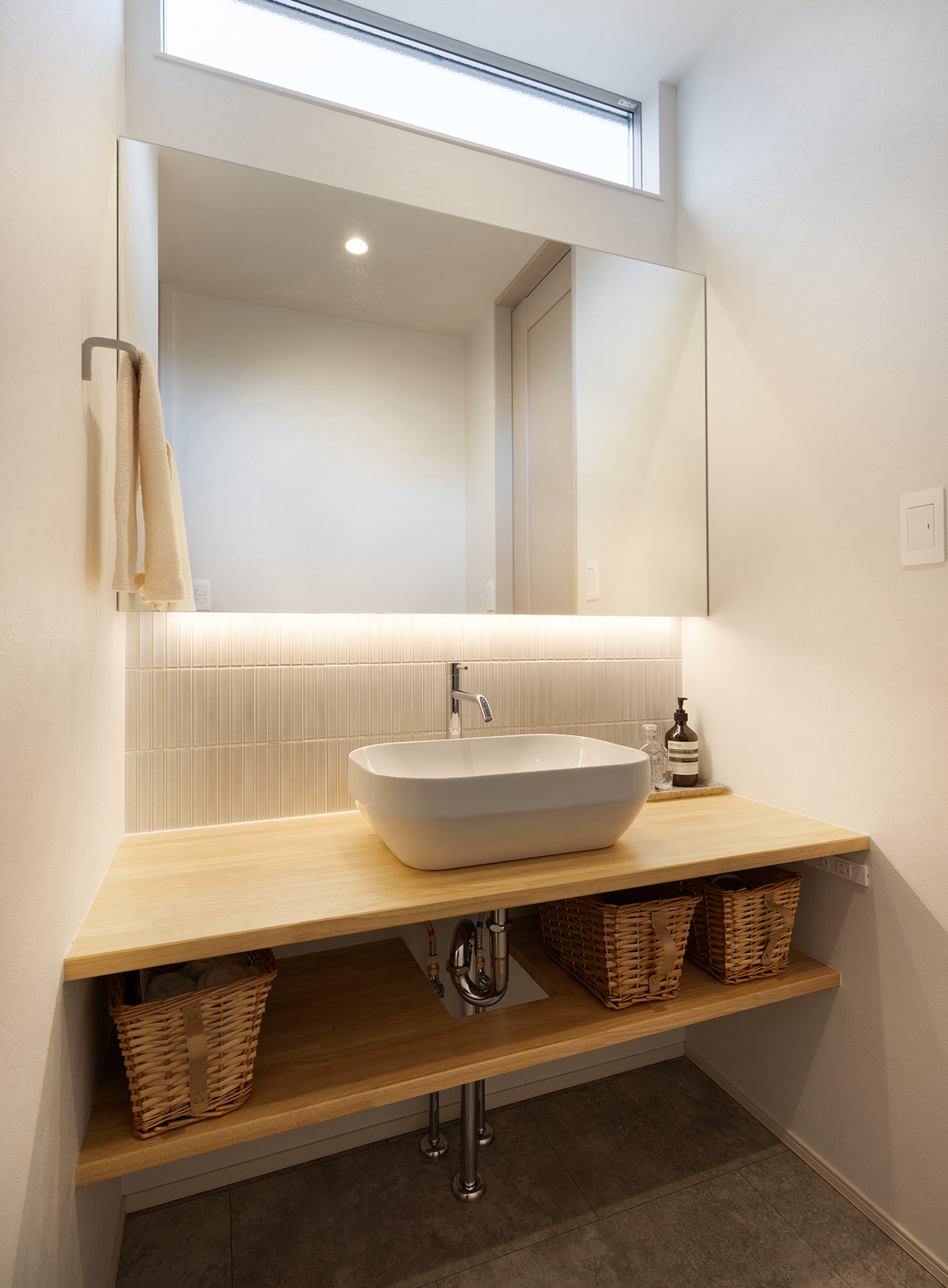 カウンター2段で構成した、ミニマルなデザインの造作洗面台。洗面台本体をシンプルにまとめることで、背面に施したタイルの繊細な表情や、ミラー下からの間接照明がより一層際立つように計画しました。
