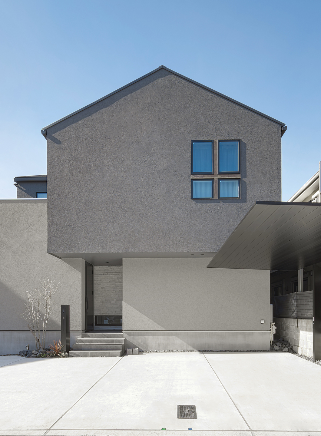 グレー二色の塗り壁を組み合わせた、切妻屋根が特徴的な外観。
