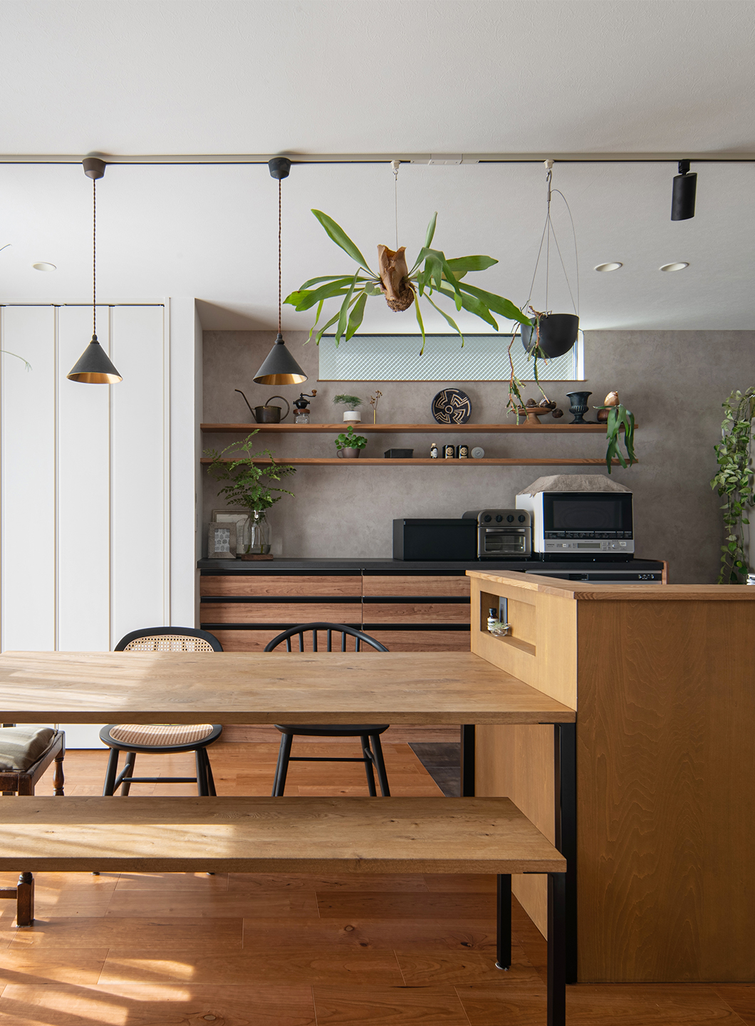キッチンとダイニング上にレールを設置して照明やグリーンを吊れるようにしました。