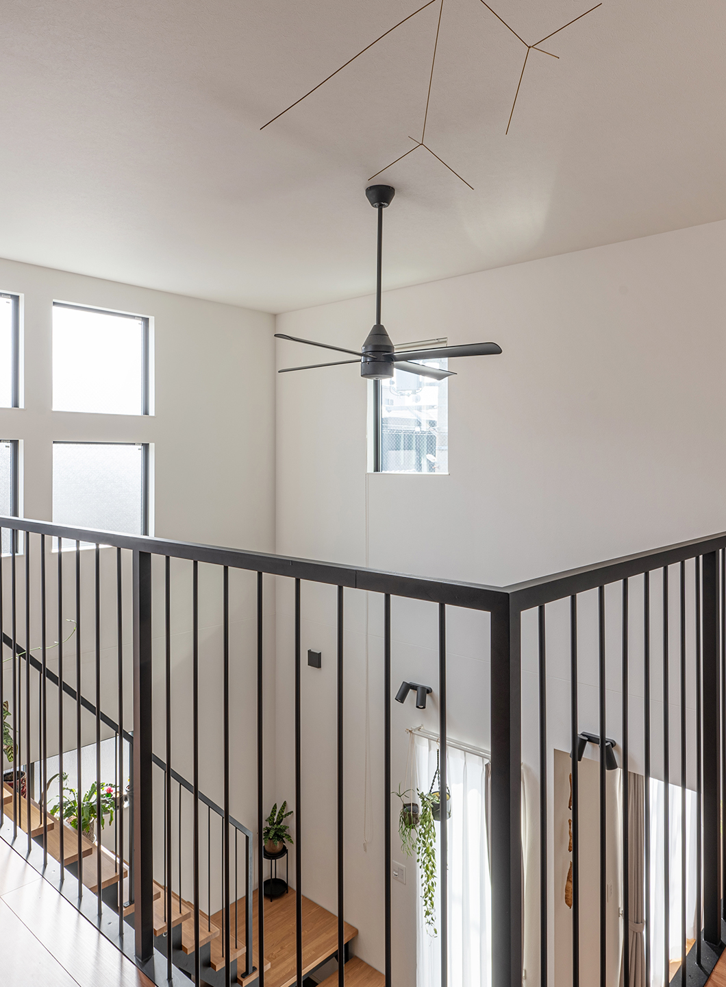 吹き抜けを回り込むように配したアイアン手すりが印象的。