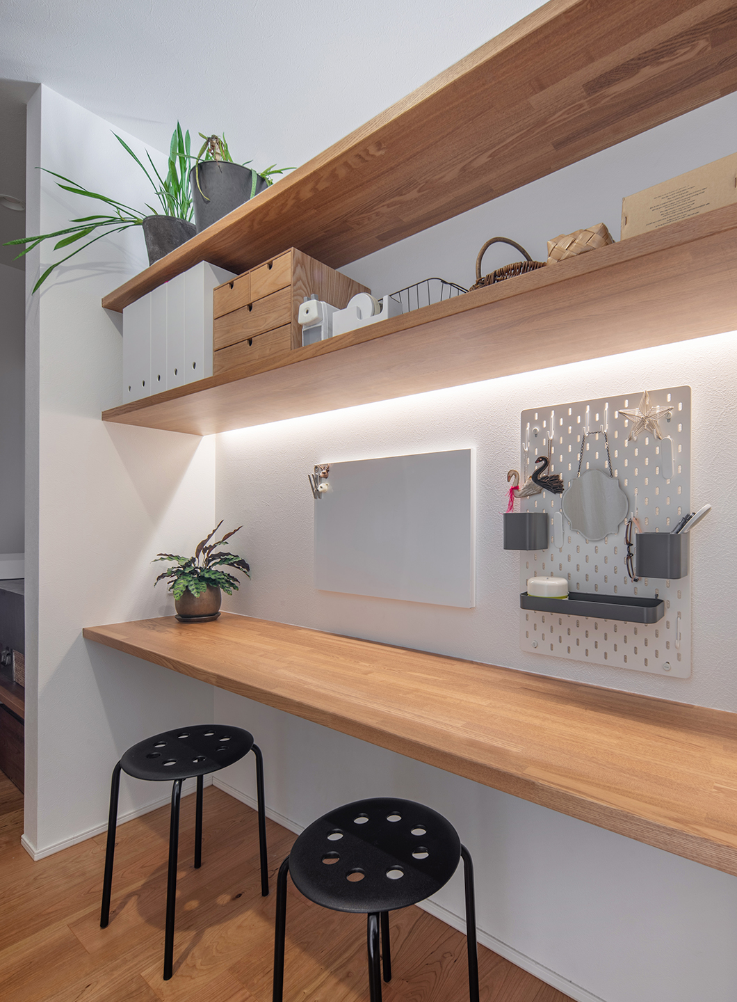 1階スタディスペース。LDKにありながら、壁を隔てて配置し、間接照明と棚で籠り感を出しています。