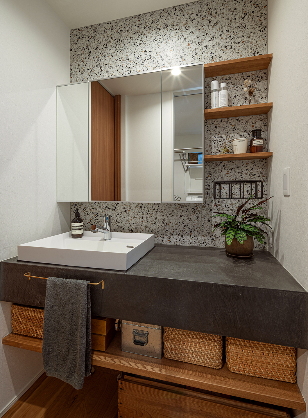 お気に入りのテラゾータイル(人造大理石)をベースとし、それに色を合わせた造作洗面台。モールテックスの色むら感が良いアクセントになっています。