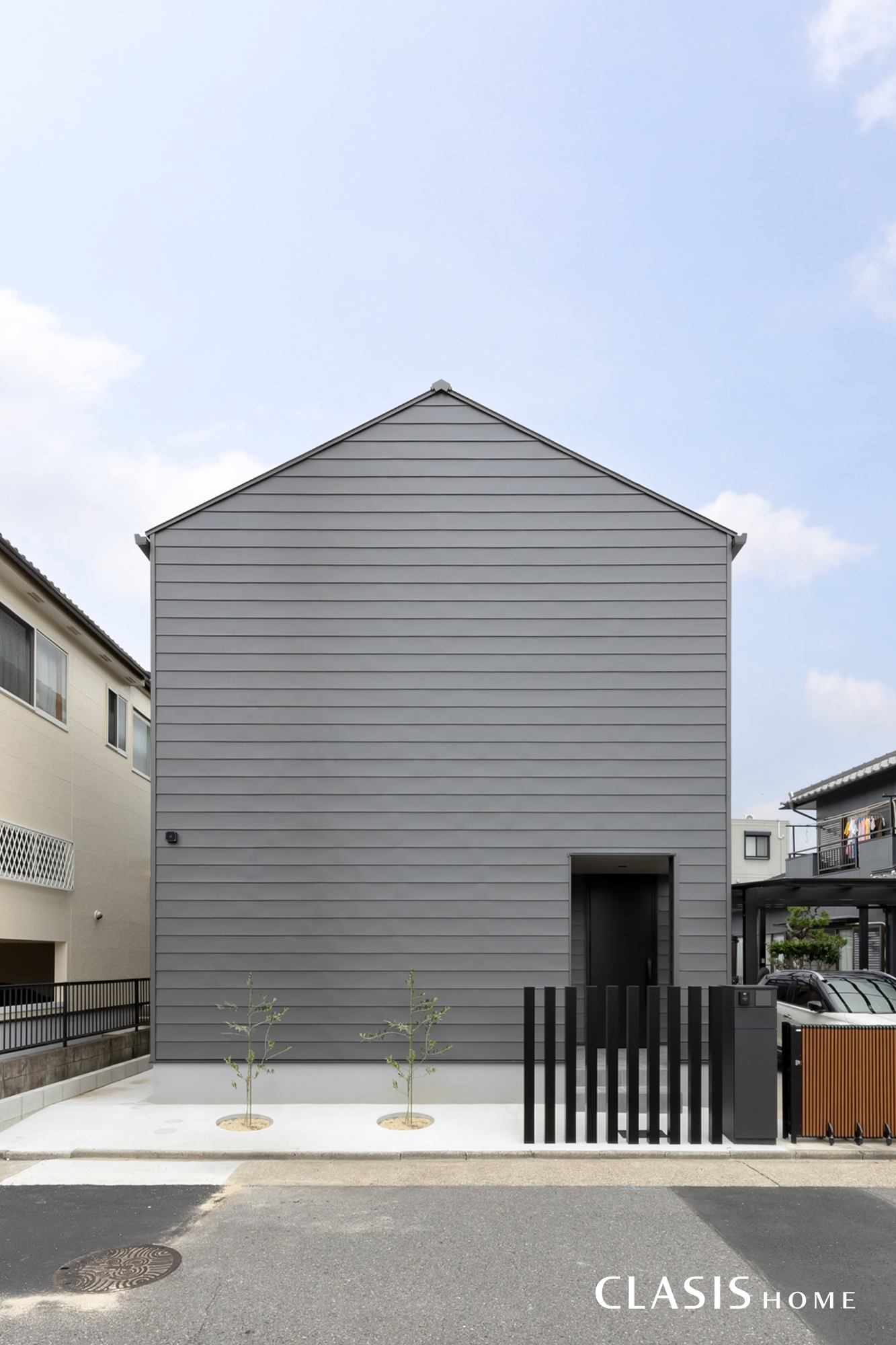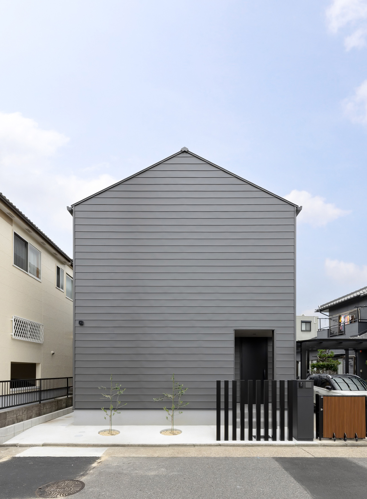 お打ち合わせ当初から三角屋根とガルバリウム鋼板の組み合わせをご希望されていたS様。よろい貼りしたガルバリウム鋼板が映えるように、すっきりとしたシンプルな外観に仕上げました。