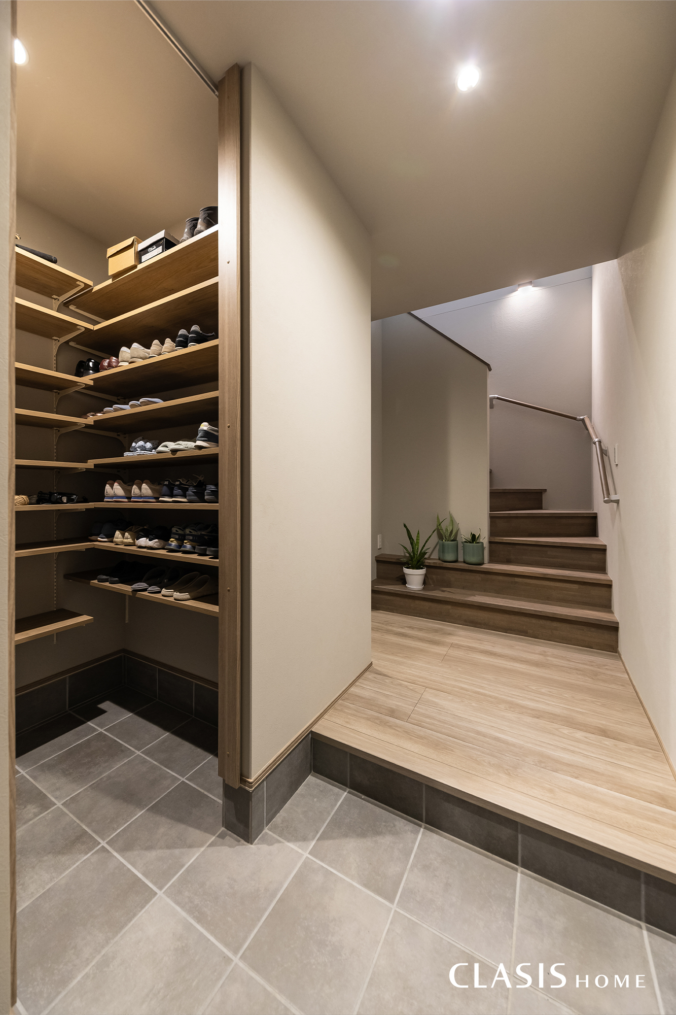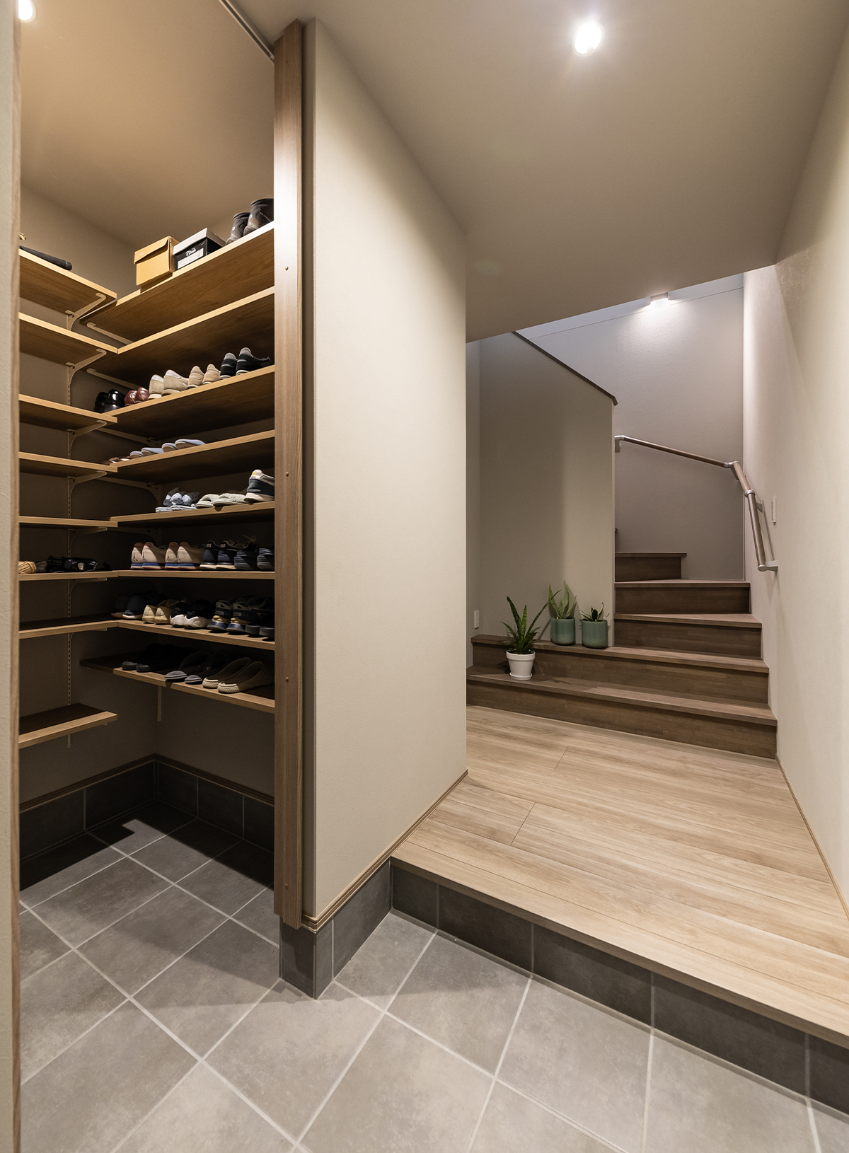 優しい色合いの玄関ホール。シューズクローゼットや飾り棚など、収納が多く機能的。2階へ続く階段はひな壇タイプを選択。お気に入りの小物が置けるように形状を工夫し、床材や建具、可動棚と色味を合わせています。