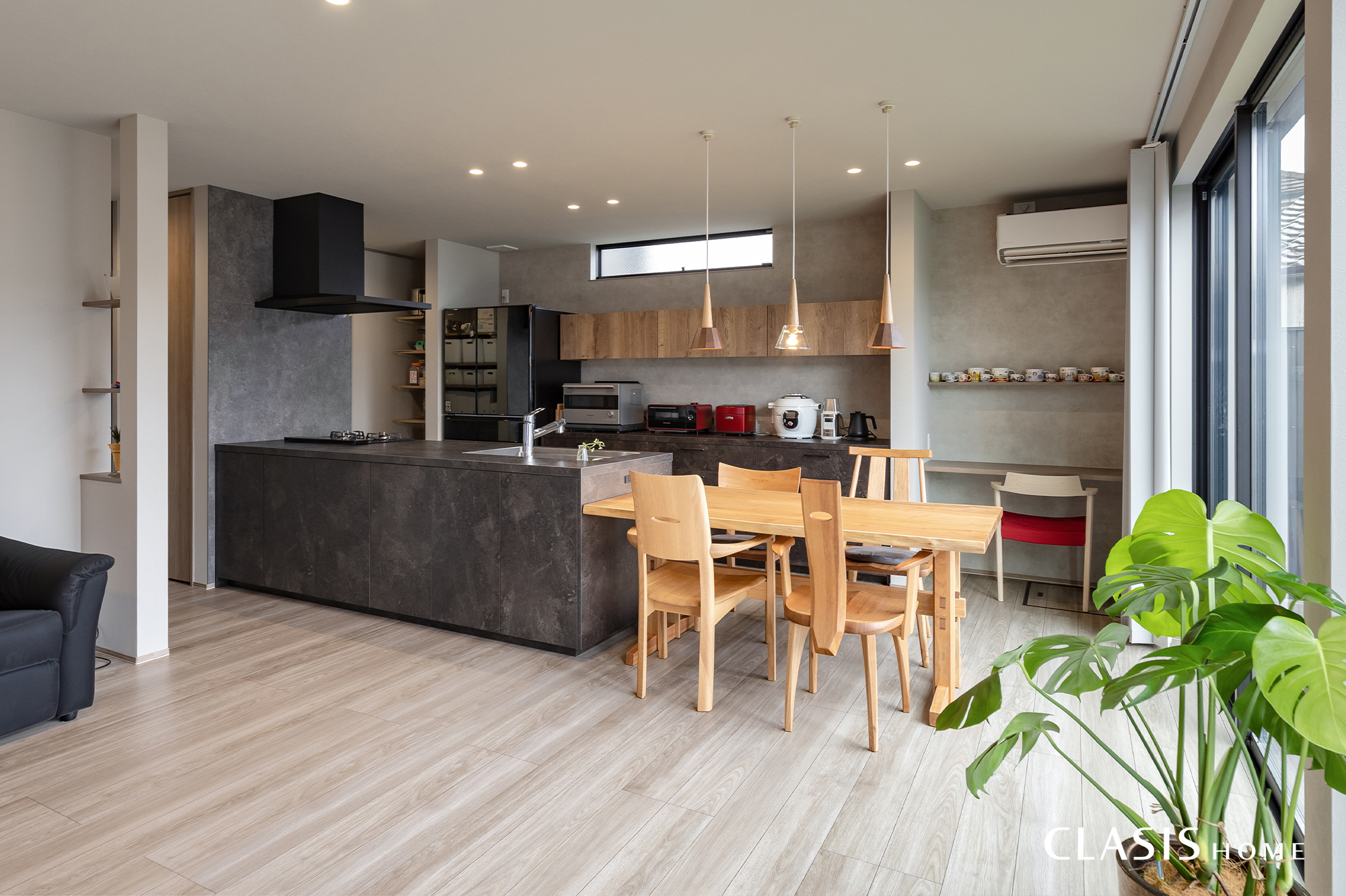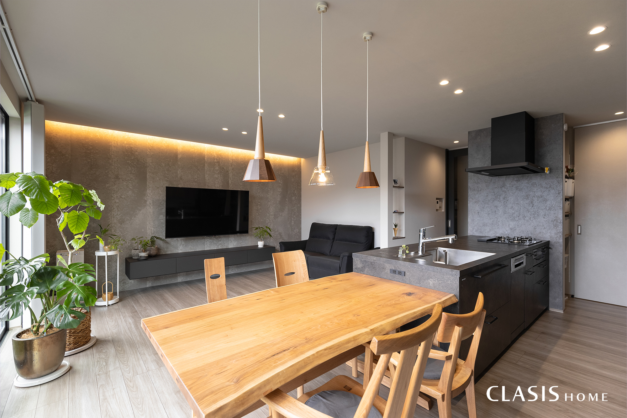 こだわりの家具や小物、グリーンが主役となるよう、落ち着きがありシンプルなコーディネートとしたLDK。床材はクラシスホームオリジナル床材のエクラスのカームオーク柄をご採用いただきました。