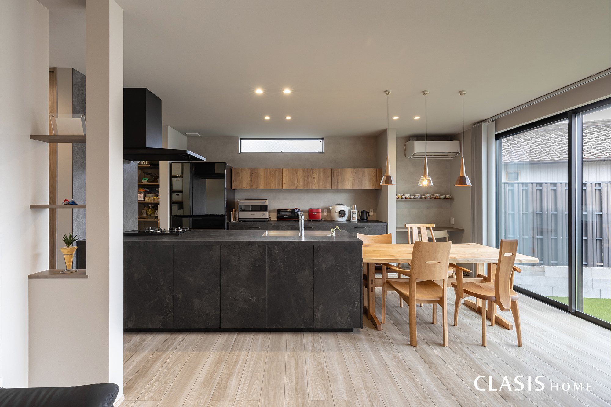 奥様こだわりのグラフテクトのキッチン。キッチンパネル(コンロ隣の壁面)はツヤ消し仕様で素材感のあるものをご提案させていただきました。