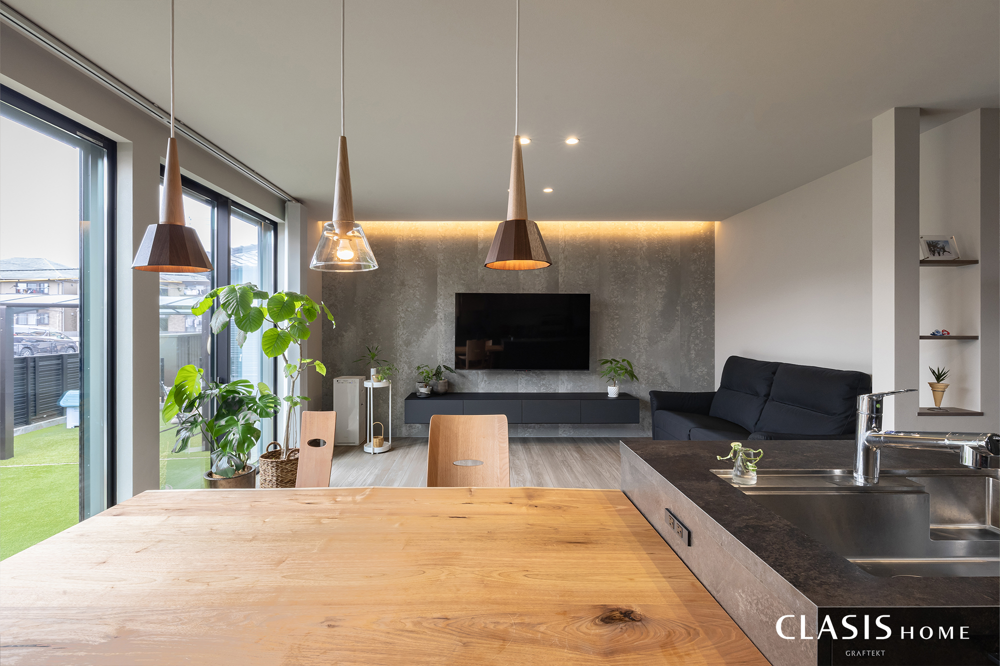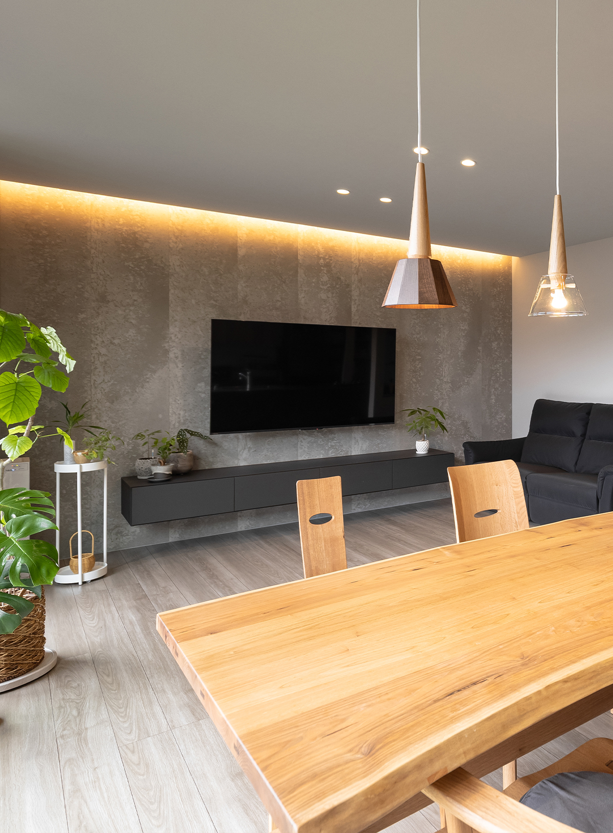 奥様からご要望がありましたSOLIDOをTV背面にアクセントとして採用しました。無機質でザラリとした質感がインダストリアルな雰囲気を引き出し、スタイリッシュで温かな空間作りが実現しました。