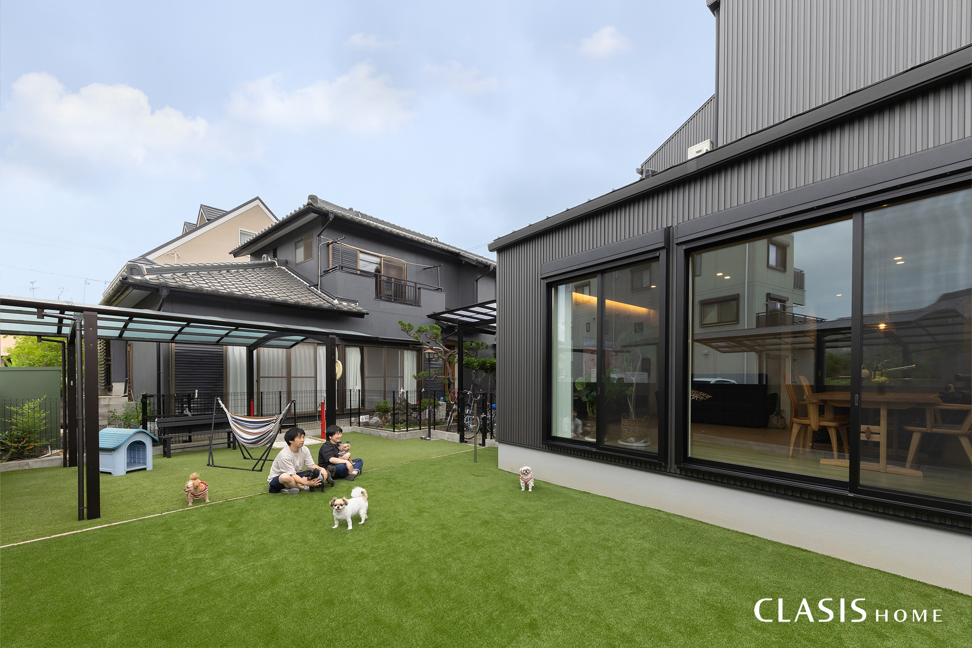 お隣に建つご実家のお庭を、そのまま一緒に使えるように計画。ワンちゃんも大満足のドッグランです。