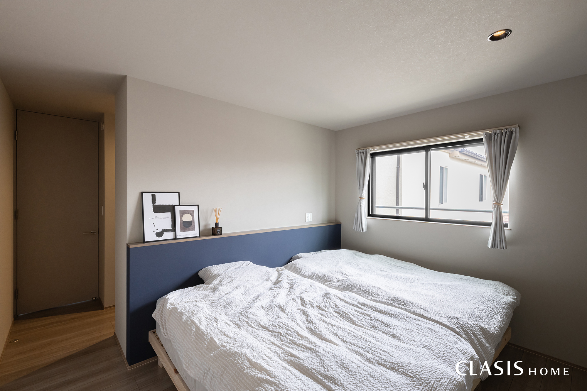 充電中のスマホや小物が置けるよう、寝室には腰壁を設けました。ご主人様からネイビーカラーをどこかに取り入れたいとご要望を頂いておりましたので、腰壁のアクセントとして採用しました。