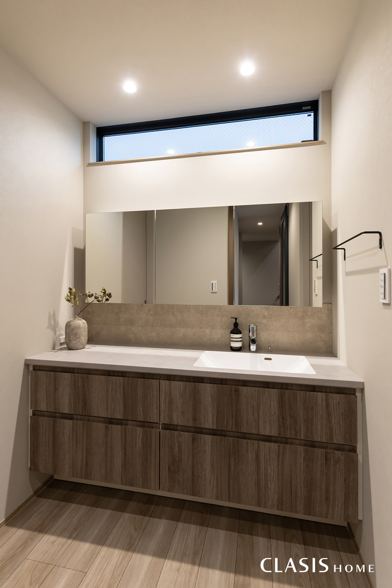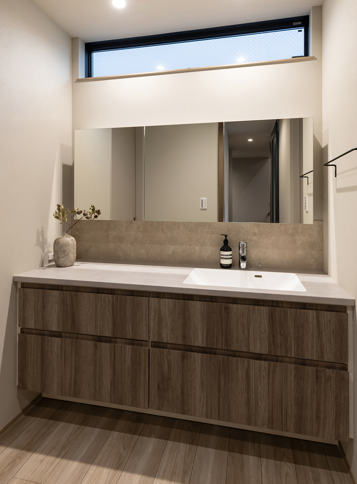 木目をメインとした温かで洗練された造作洗面台。フレームレスの三面鏡を用いてスッキリとした印象にしています。鏡面下はセラールを採用し、空間と馴染むアクセントにしています。
