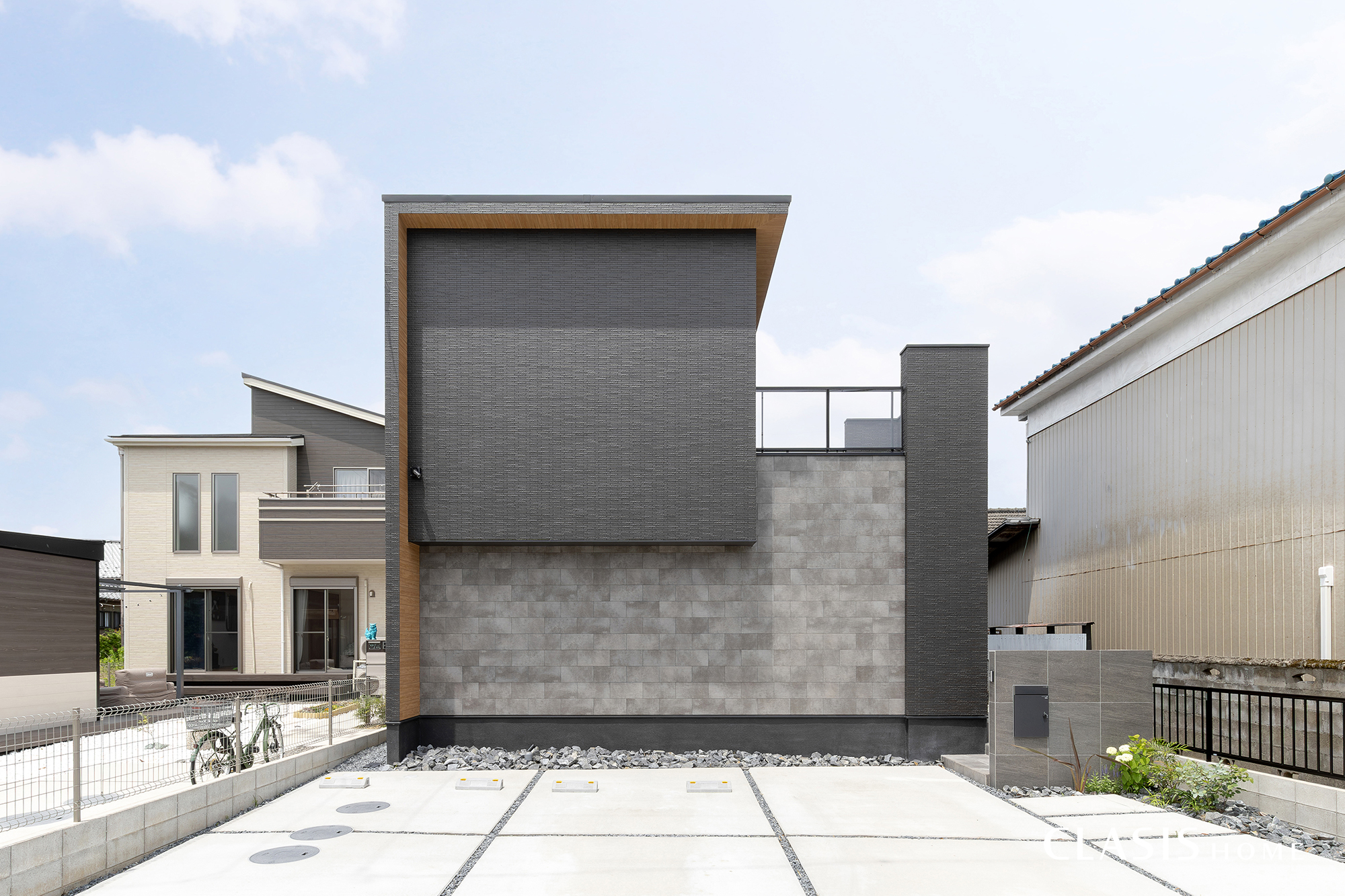 木目を覗かせるフレームと2種類のグレーのタイルを貼り分けたシンプルモダンの外観。バルコニー手摺りとして設置したクリアなモダンパネルはお施主様のこだわりです。
