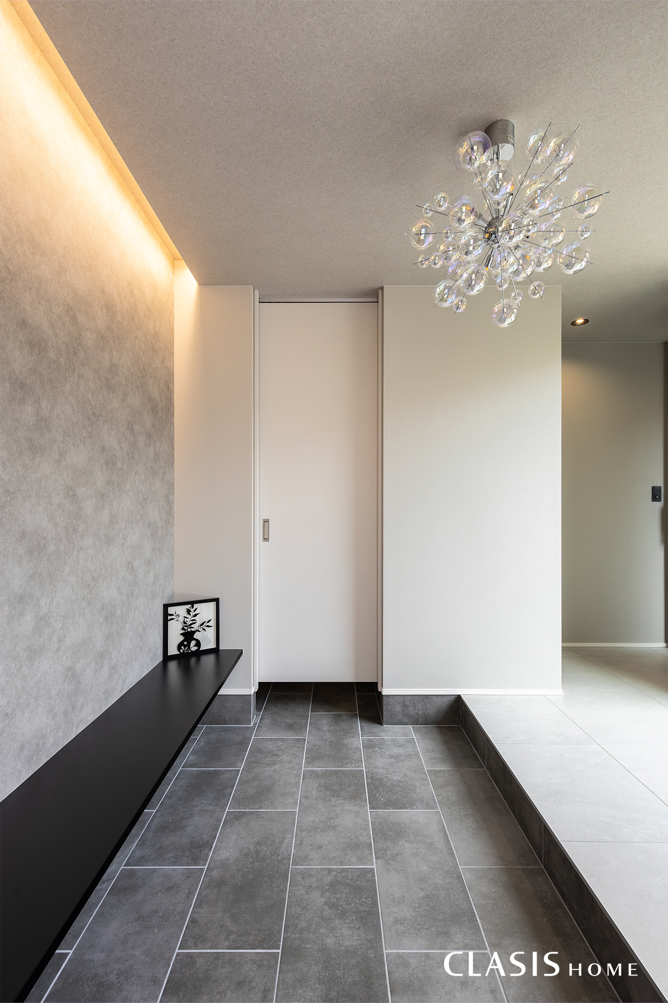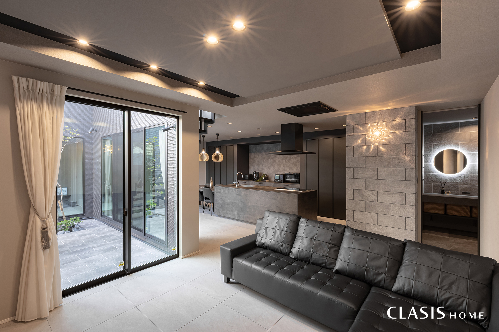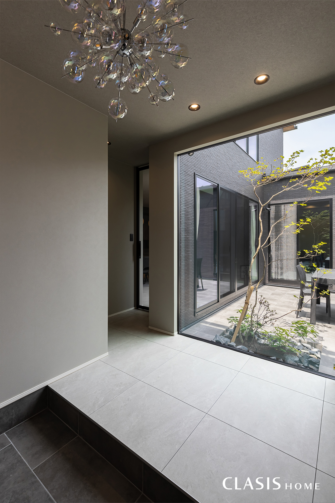 玄関を開けると、大きな窓越しに中庭が広がり、やさしい光が出迎えてくれます。中庭を挟んだLDKからも玄関の様子が見えるため、家族の帰宅にも自然と気が付く間取りです。シャボン玉のようなシャンデリアやベンチ、間接照明で華やかに訪れる人をお出迎えするコーディネートです。