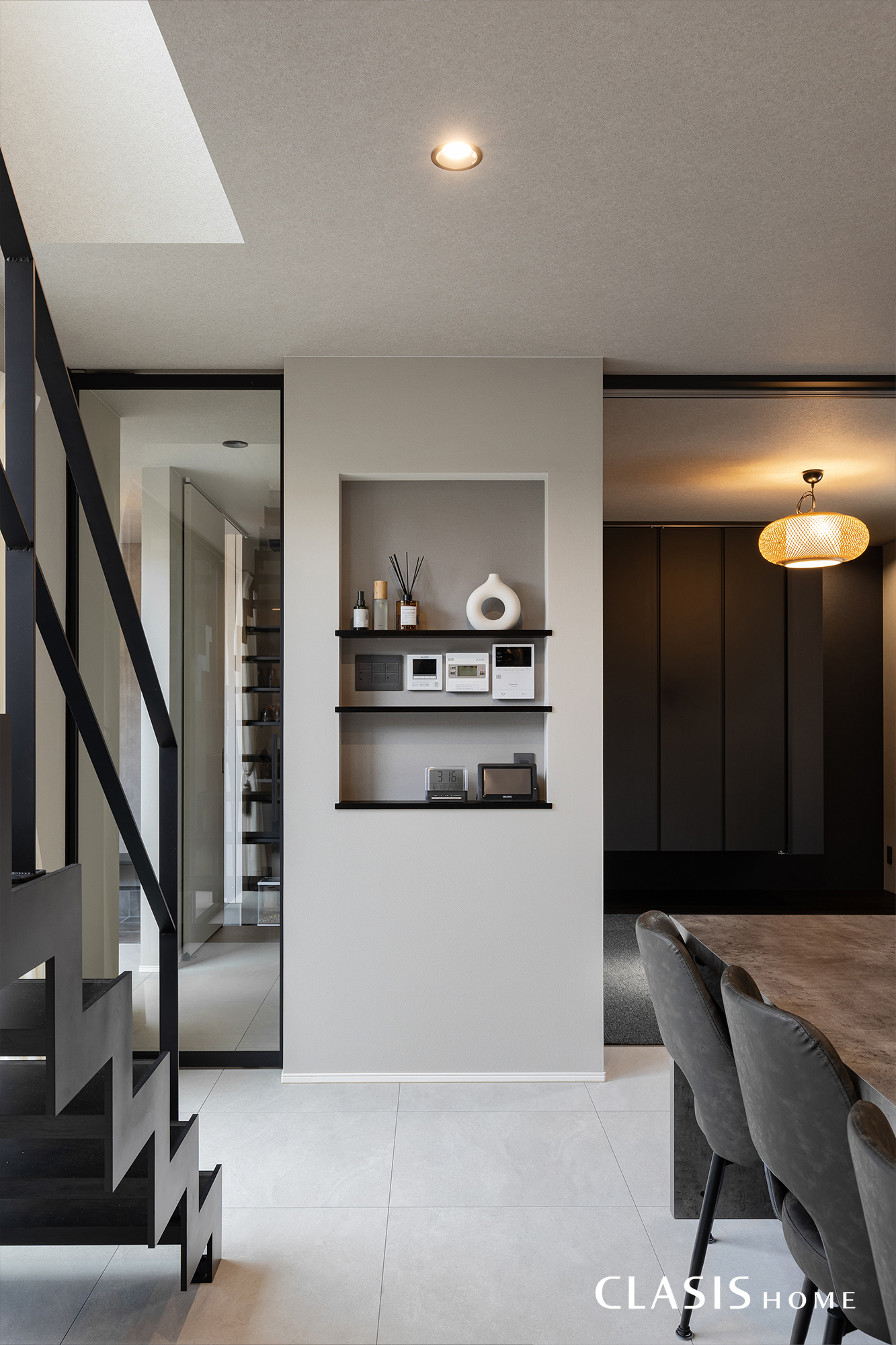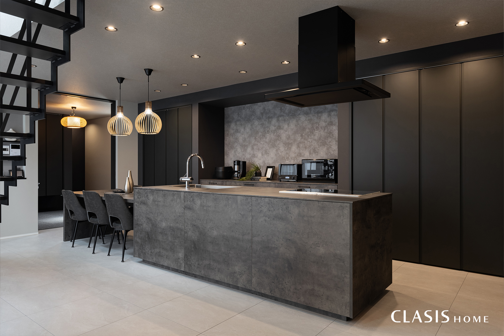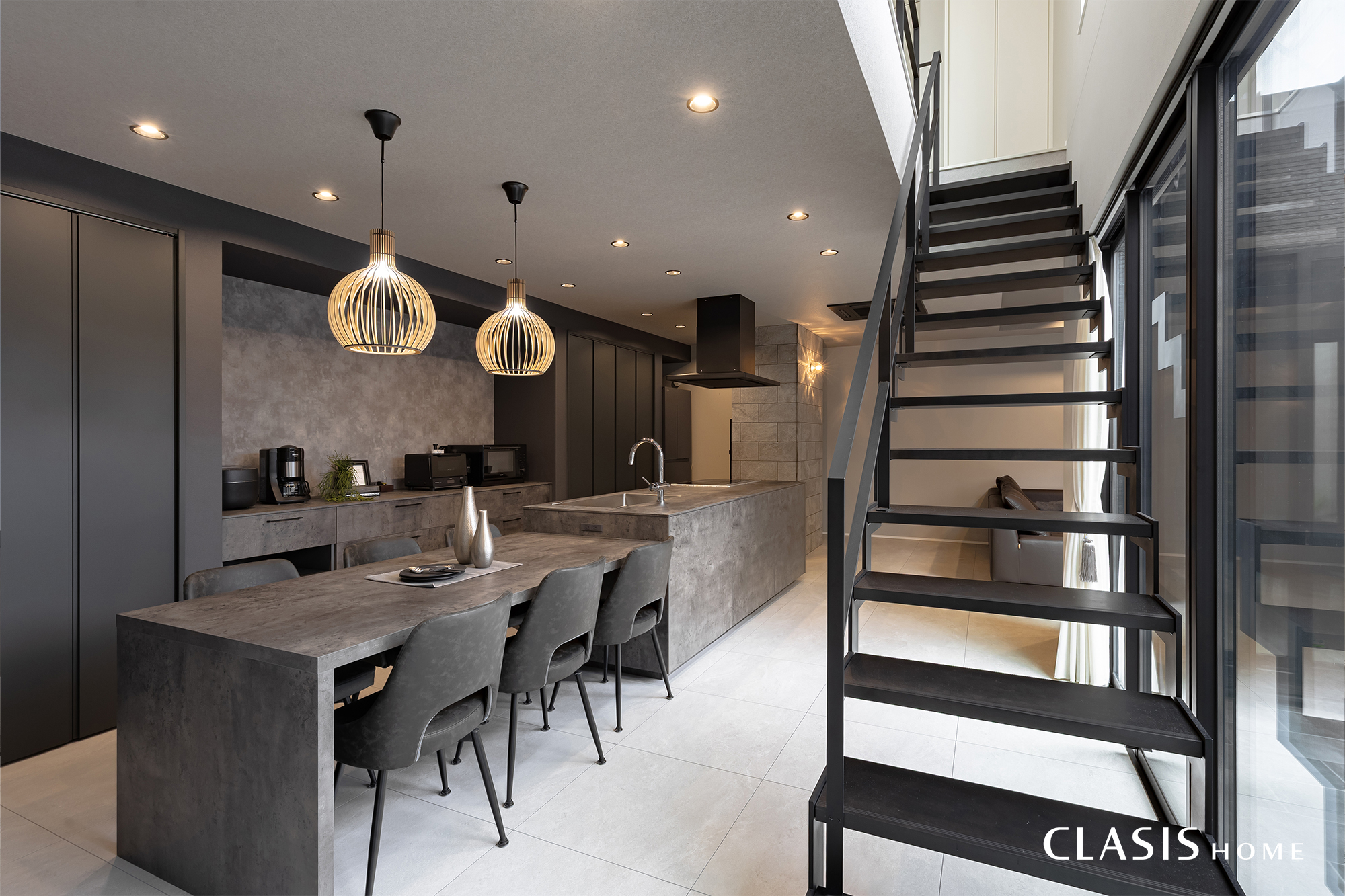 モノトーンを基調としたダイニングキッチン。視線が奥へ抜ける鉄骨階段は空間が広く感じられるのが魅力的。階段自体がインテリアの一部となり、空間に心地よい抜け感をプラスしてくれます。