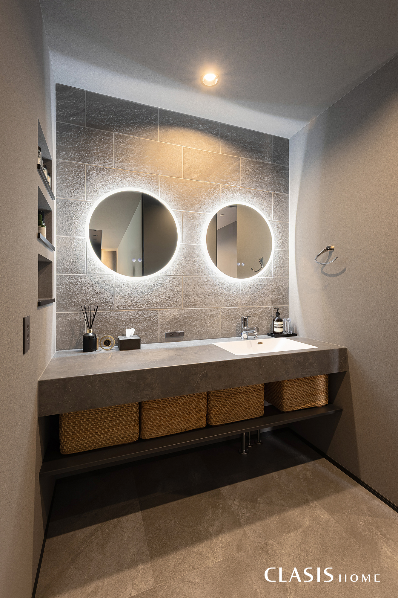 ホテルライクな造作洗面もテレビ面や壁面とお揃いのタイルで統一感をもたせました。タイルの凹凸が丸ミラーの間接光により引き立てられ、重厚感のある印象に。