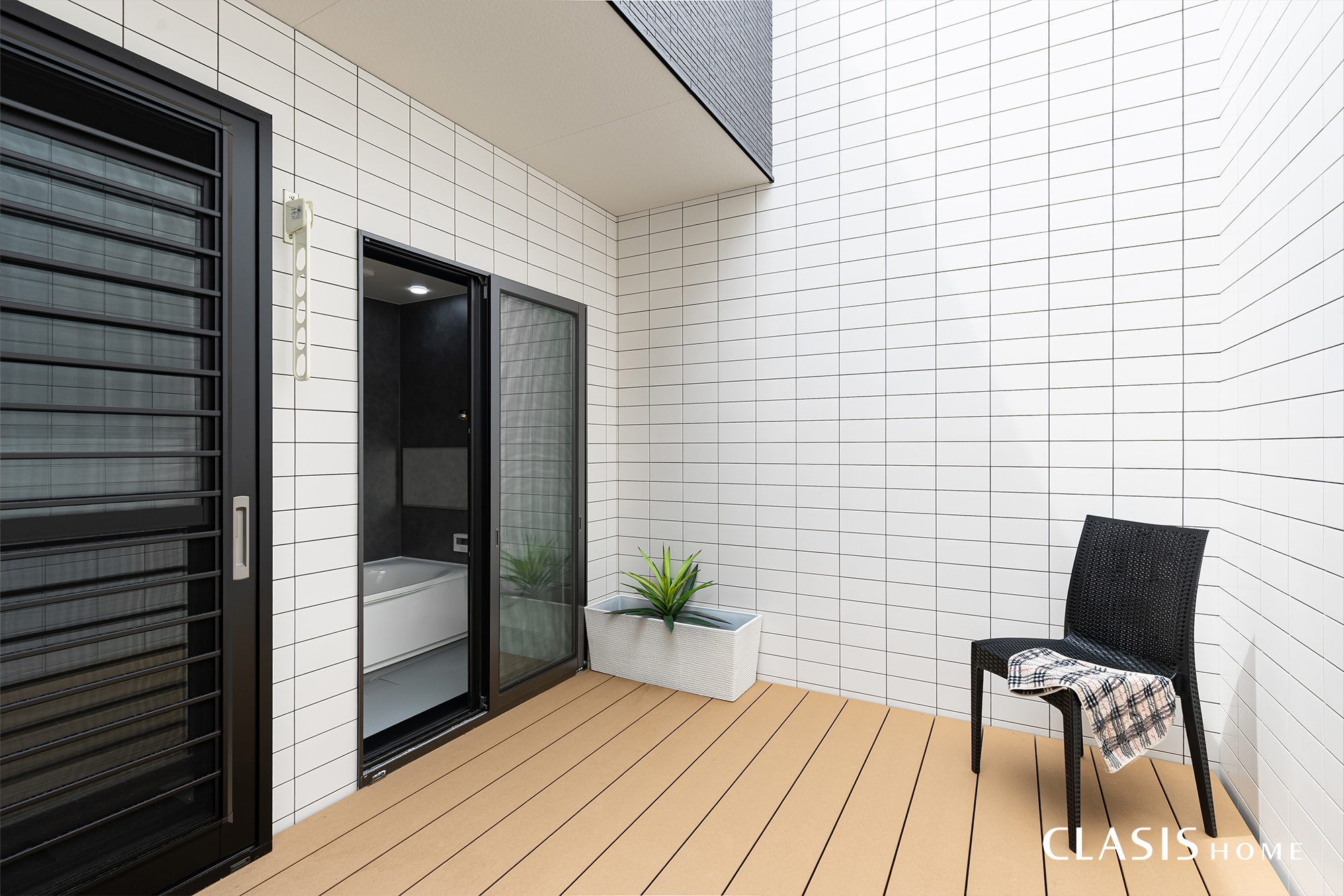 「浴室から外に出てそのまま外気浴がしたい」というご要望を実現するため、視線が入らない高い壁で覆ったプライベートなテラスを計画しました。植栽の場所には開口があるため、風が程よく通り抜けます。