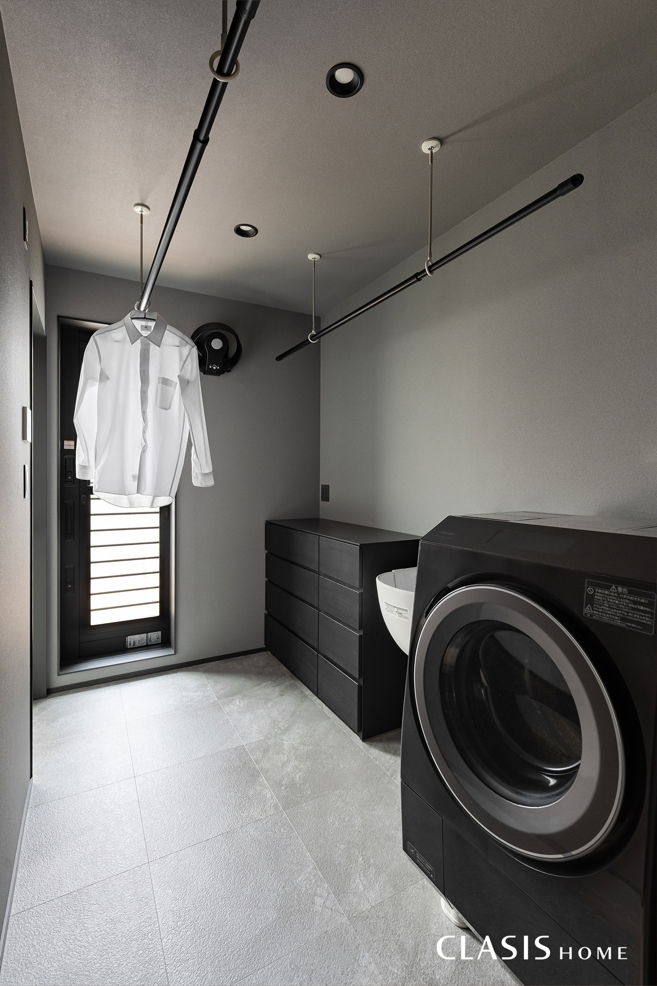 脱衣室兼ランドリールーム。テラスへも出入りができるため、洗濯物に応じて外干しと室内干しを使い分けられる便利な設計です。