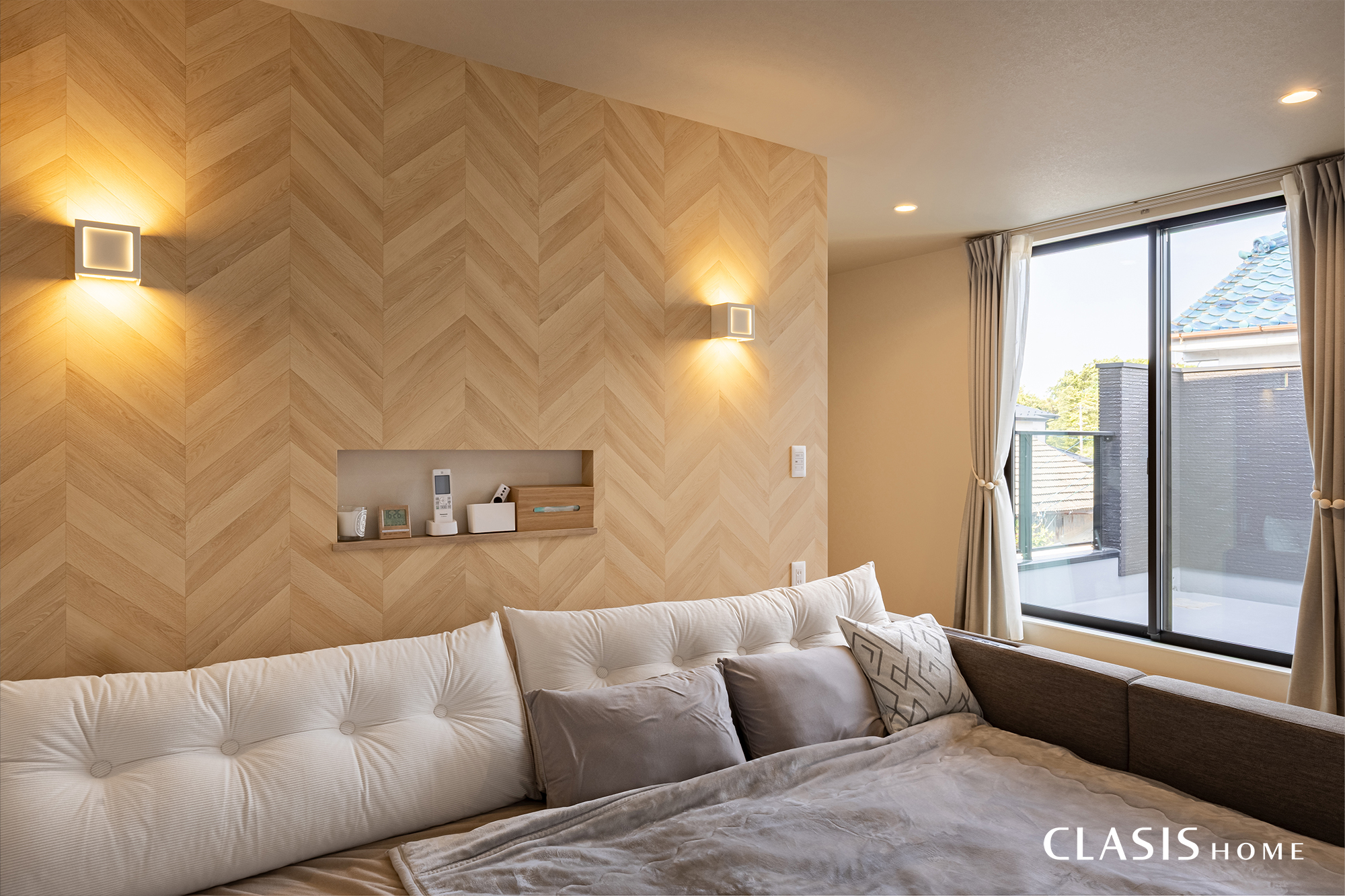 寝室は1Fと雰囲気を変えてナチュラルテイストに。ヘリンボーン調のクロスとブラケット照明の間接光が温かみのあるくつろぎの空間を演出しております。