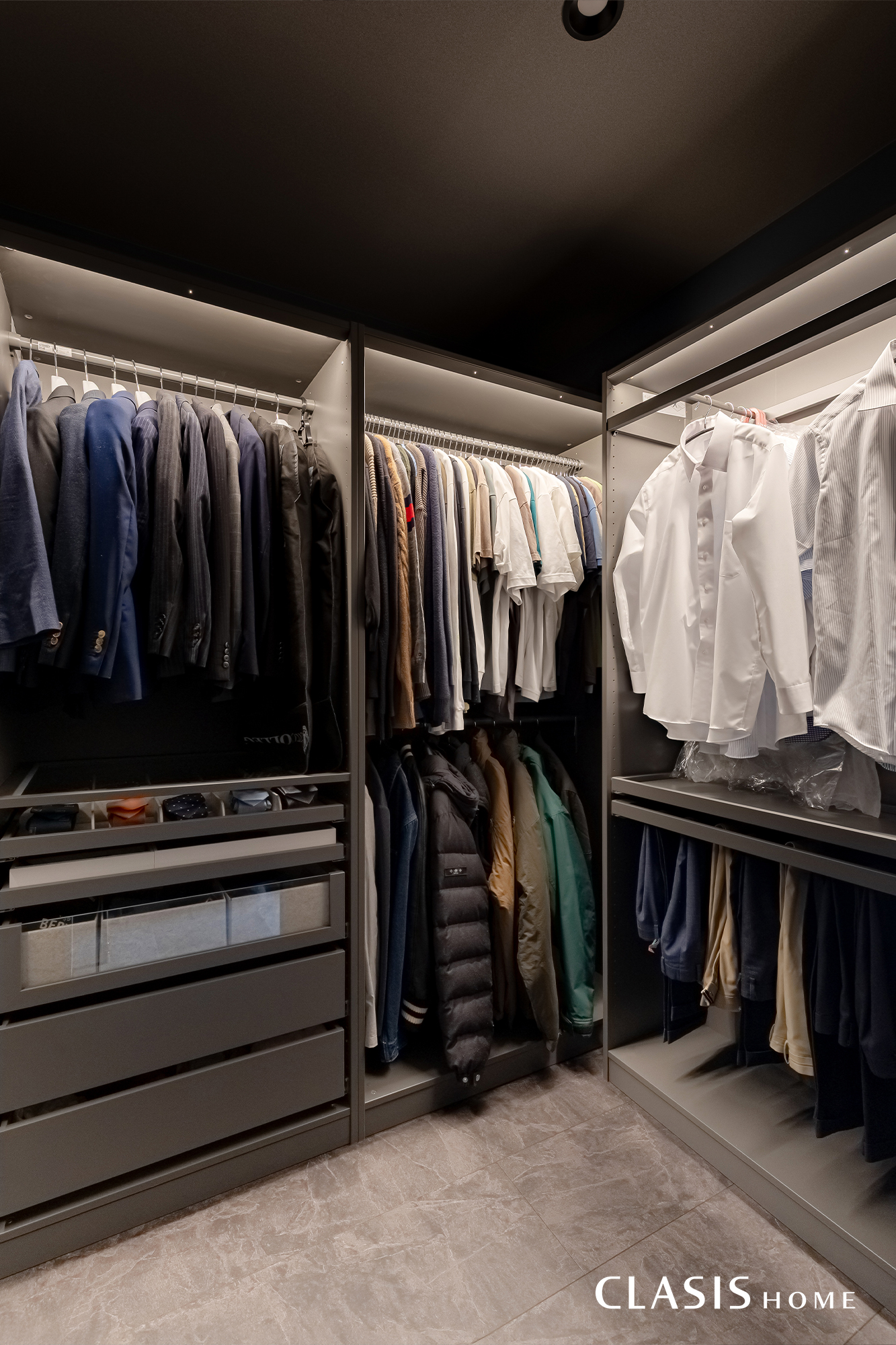 お施主様が自ら設置されたシステム収納の1階クローゼット。収納内に組み込まれた間接照明が映え、ブティックのような空間になりました。