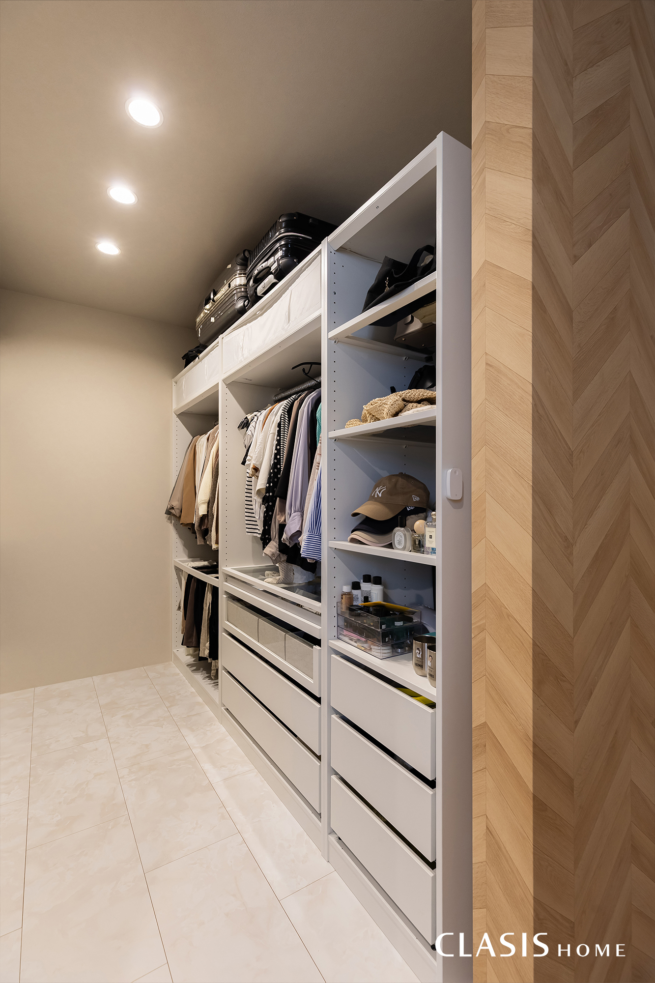 寝室内の2階クローゼット。明るく優しい雰囲気のコーディネートです。