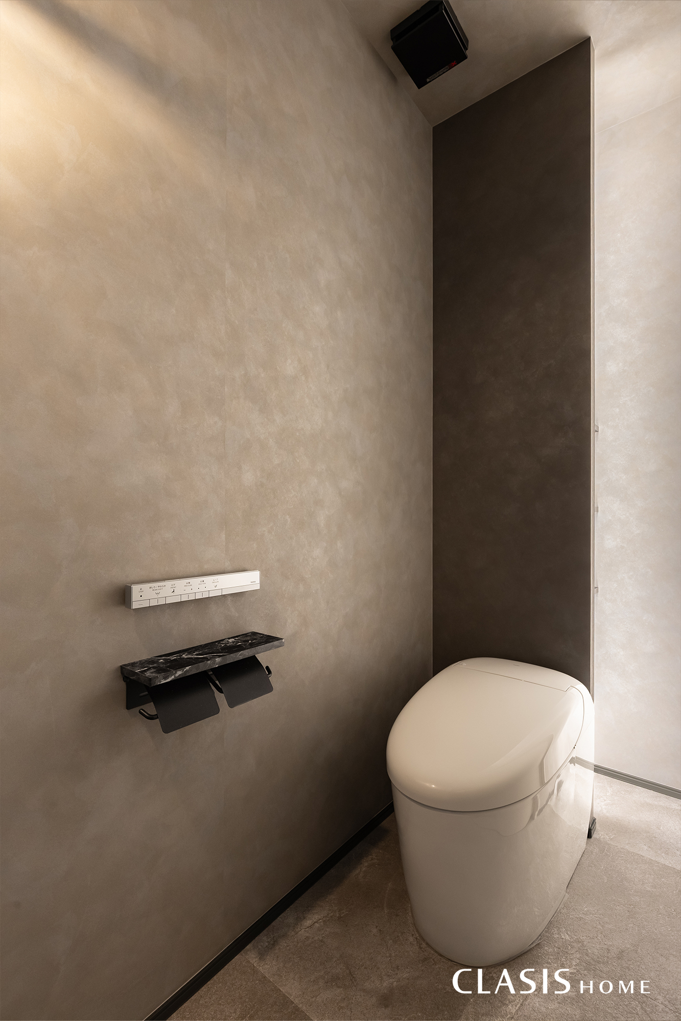 シンプルモダンにまとめたトイレ。背面は扉レスタイプの収納になっており、間接照明でやわらかく室内を照らしています。