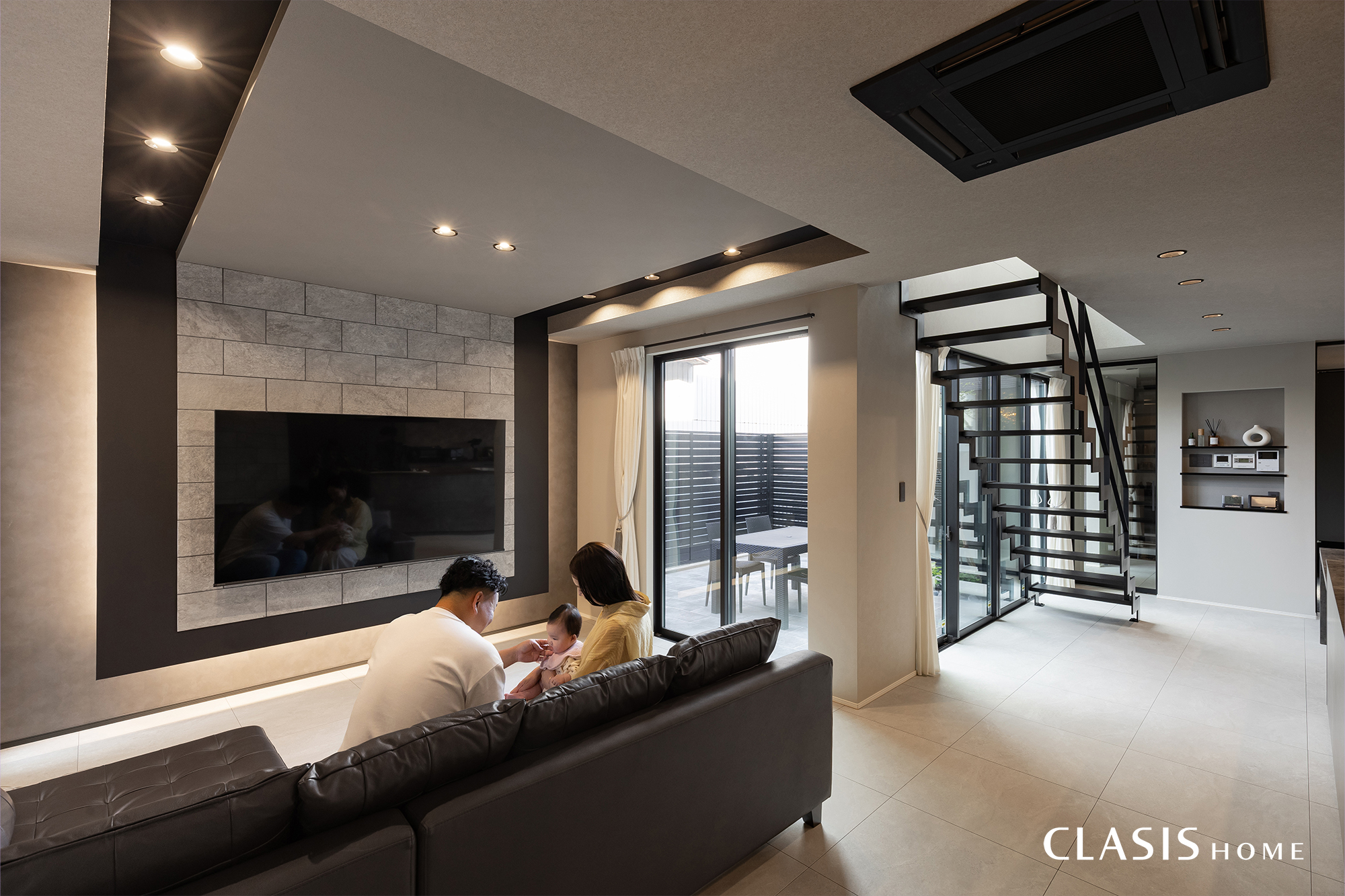 大きな窓越しに庭のタイルデッキがアウトドアリビングのように感じられるリビング。立地条件やフェンスの高さなどを考慮することで、カーテンを開けたままでも過ごせる開放感のある空間になりました。