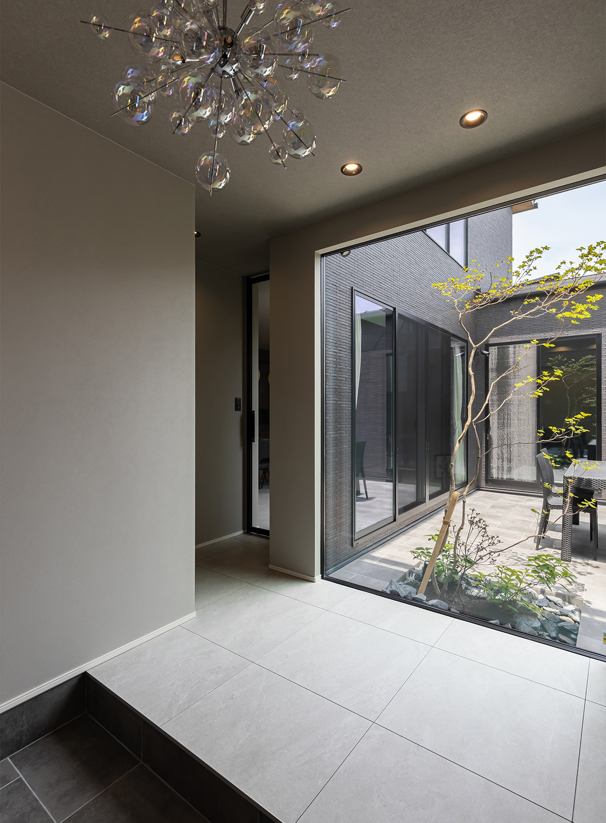 玄関を開けると、大きな窓越しに中庭が広がり、やさしい光が出迎えてくれます。中庭を挟んだLDKからも玄関の様子が見えるため、家族の帰宅にも自然と気が付く間取りです。シャボン玉のようなシャンデリアやベンチ、間接照明で華やかに訪れる人をお出迎えするコーディネートです。
