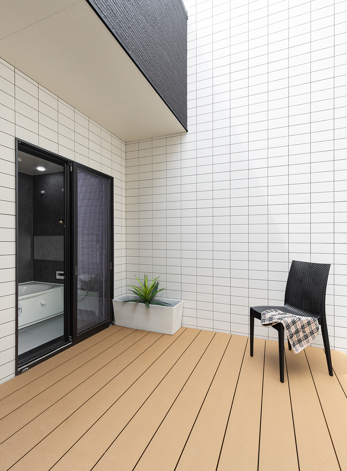 「浴室から外に出てそのまま外気浴がしたい」というご要望を実現するため、視線が入らない高い壁で覆ったプライベートなテラスを計画しました。植栽の場所には開口があるため、風が程よく通り抜けます。