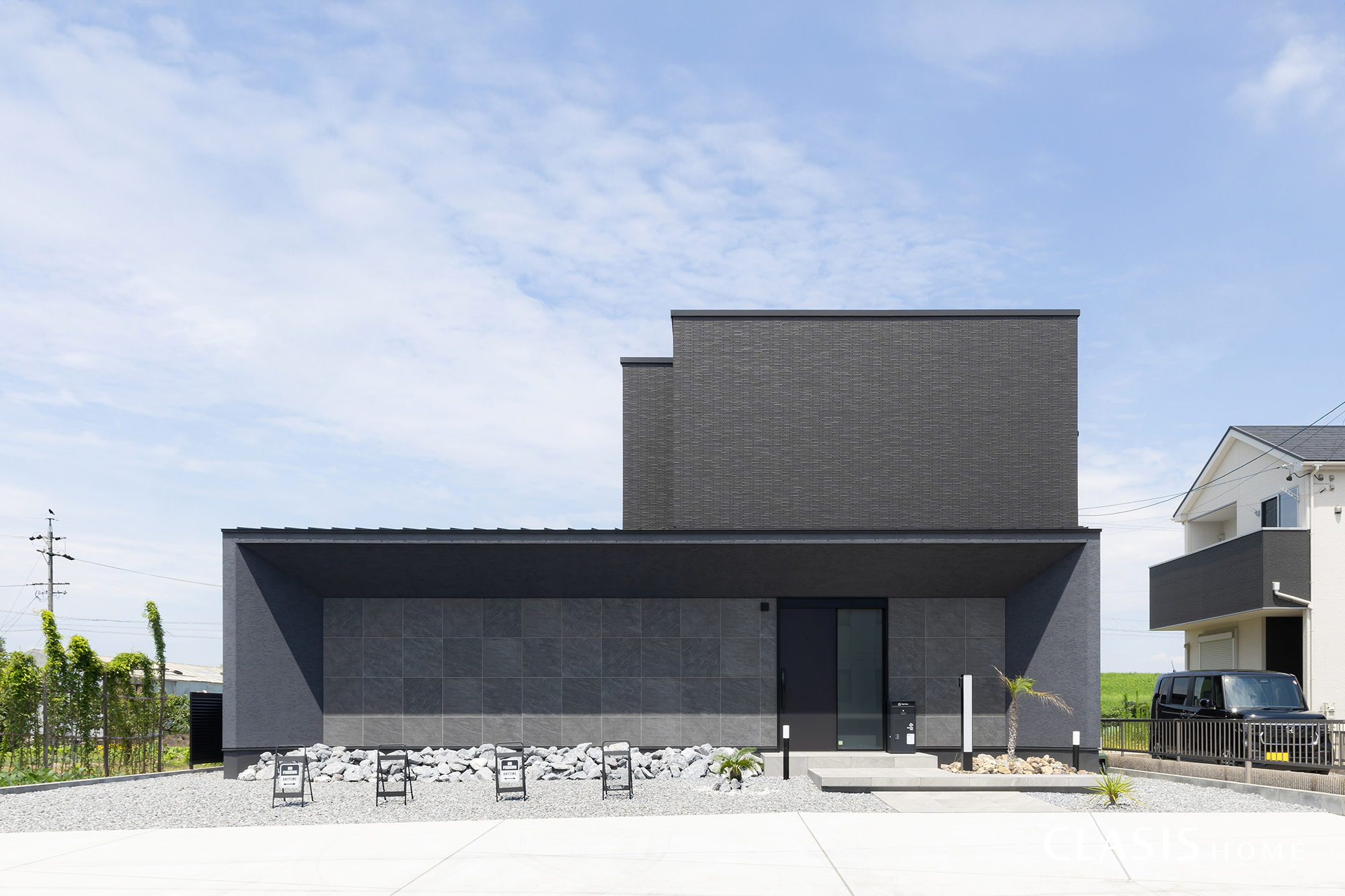 ブラックで統一したスタイリッシュな外観。塗り壁のワイドフレームを大判タイルを囲うように施しました。正面に窓を設けない閉じた印象のファサードは、静謐さを感じさせる佇まいです。