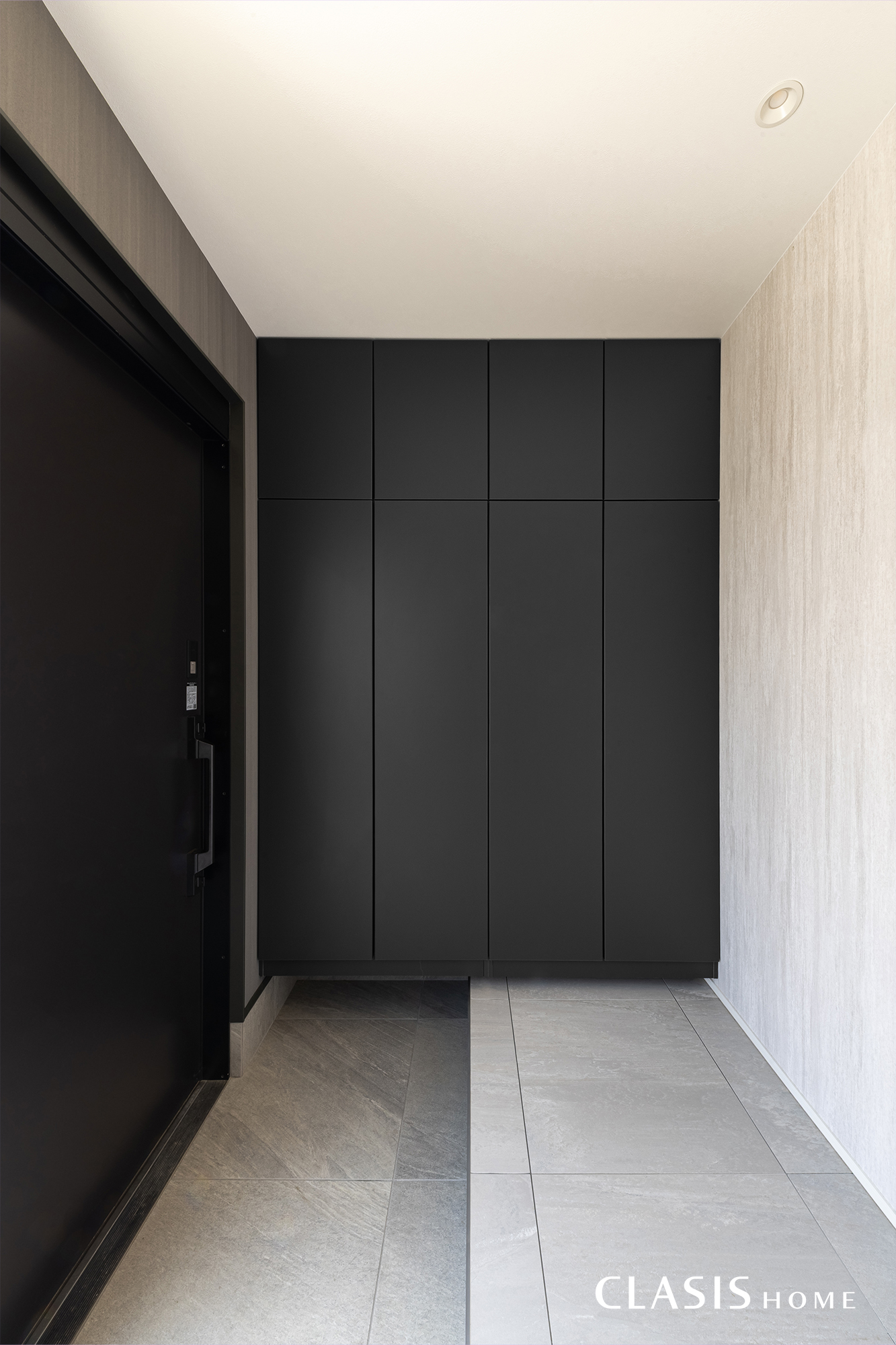 床から天井まで壁一面に玄関収納を設けました。空間にピッタリ納めることで、生活感を無くしています。向かい側にはお持ち込みの家具やお気に入りの雑貨を飾れるスペースを設けました。背面のクロスをブラックとすることで家具自体がスッキリと馴染み、主張しすぎないように計画しました。