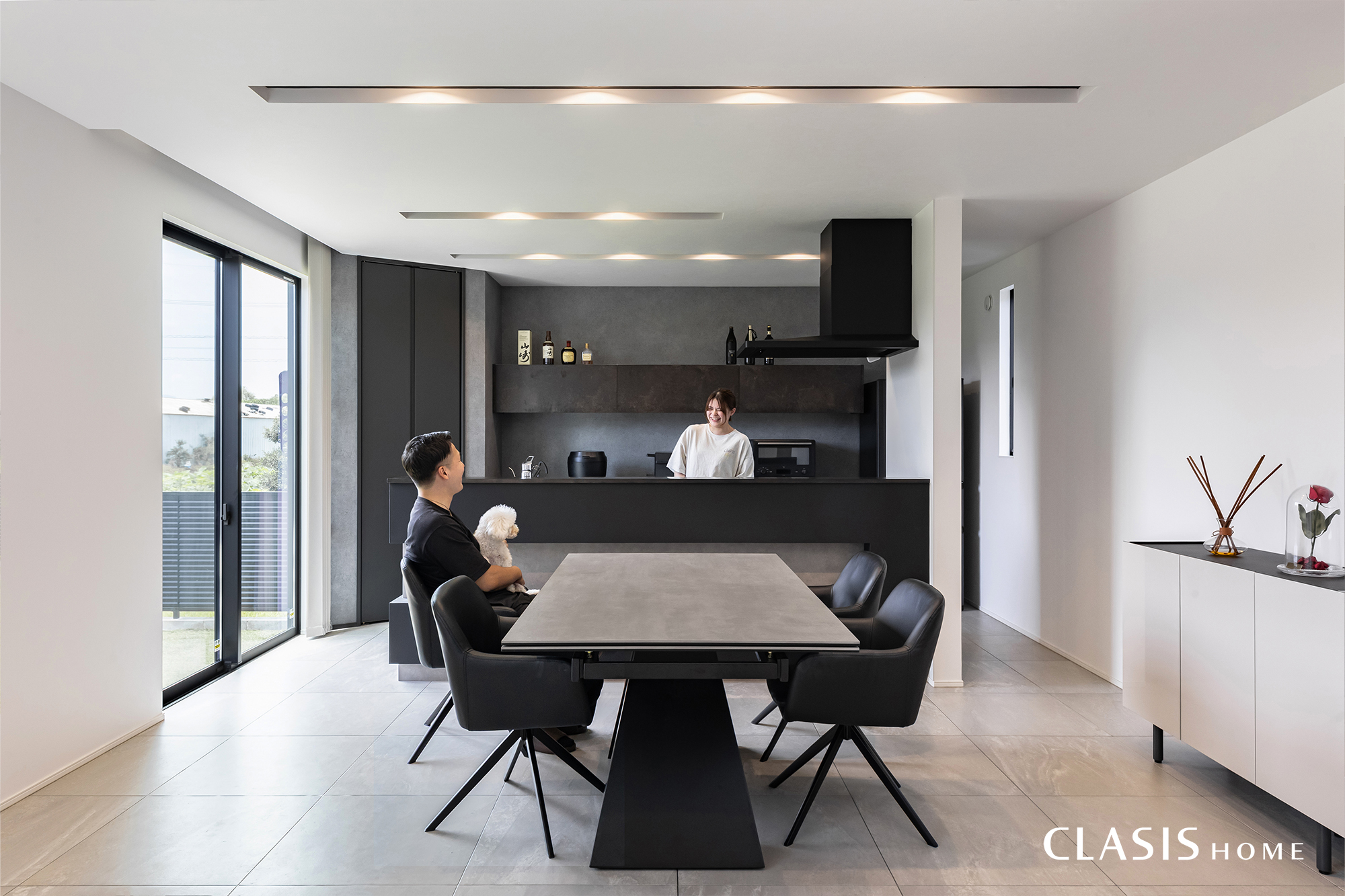 ダウンライトは折り上げた天井部分に隠すことにより、生活感を感じさせない仕様に。キッチン廻りは色合いを落とし、ブラックとグレーでまとめてシンプルで大人っぽいコーディネートにしています。