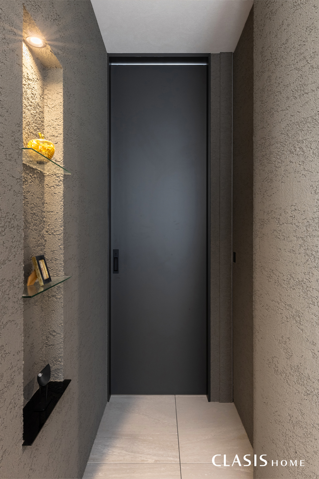 洞窟に入るような空間にしたいとのお施主様からのご要望を受け、ファミリークローゼットへ繋がる右手の扉を壁と同じ塗装を施し、隠し扉のように存在感を無くしました。塗り壁で囲われ、照明をニッチの中のみとした、特別な雰囲気のある空間を作りました。