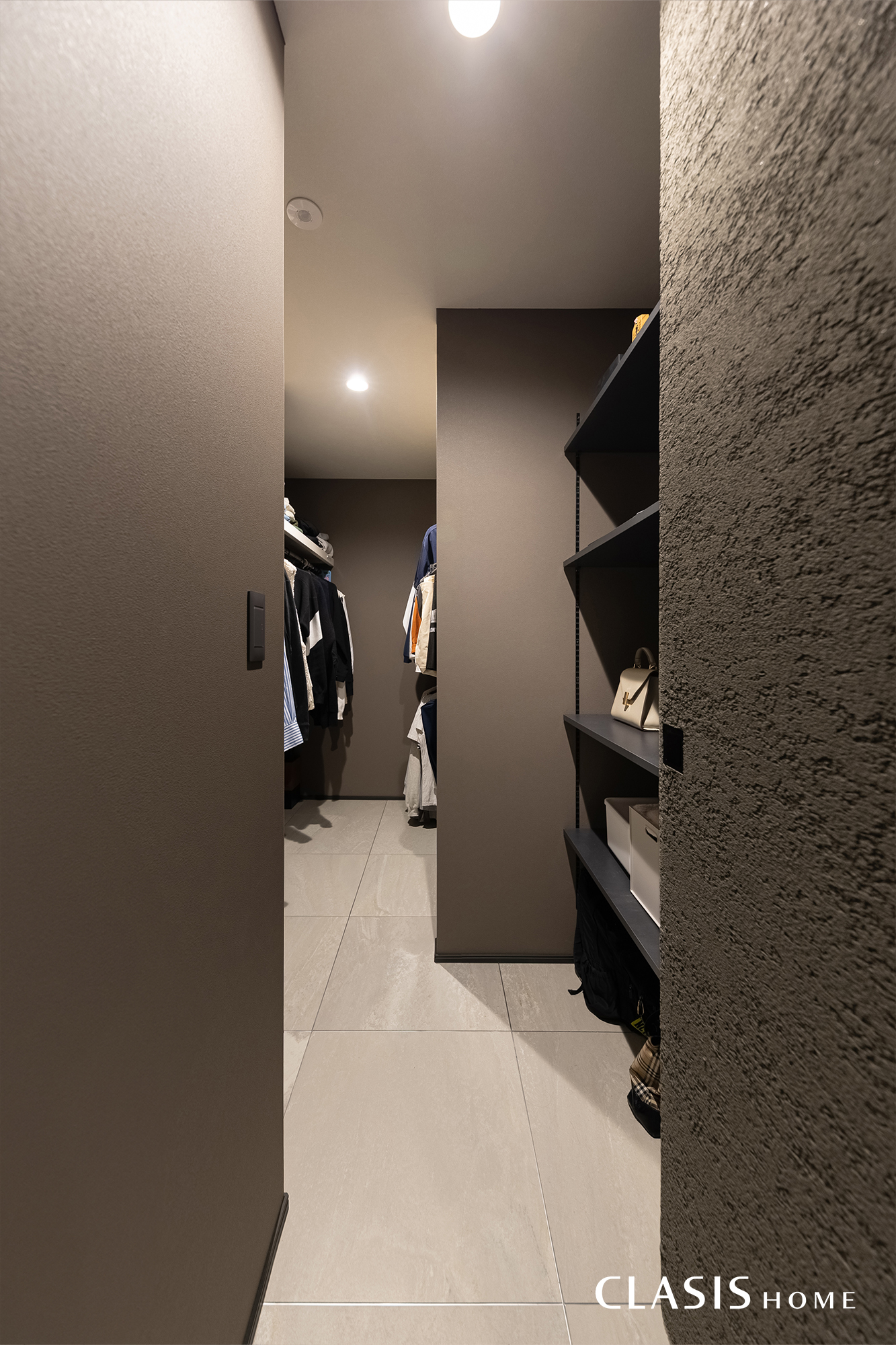 塗り壁で存在感を消した扉を開けると、奥行きのあるファミリークローゼット。ブラウンのクロスを使用して大人っぽい雰囲気にしています。