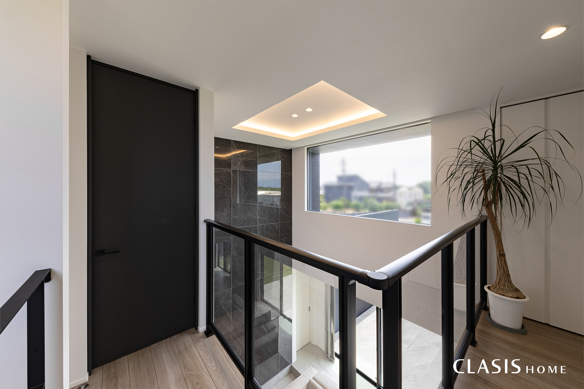 モノクロで構成されたホテルライクなLDK。2階の手摺りにはアクリルパネル製のものを使用することで、より視線が抜けて空間の広がりを感じられます。