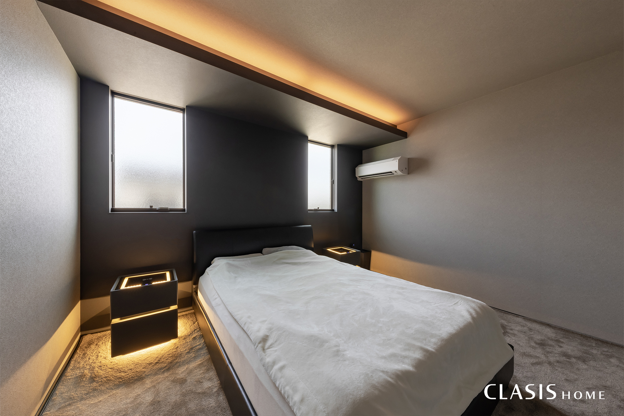 折下げ天井から間接照明の光が柔らかく注ぐシックな寝室。他の居室よりワントーン落とした色合いで落ち着いた印象に仕上げました。