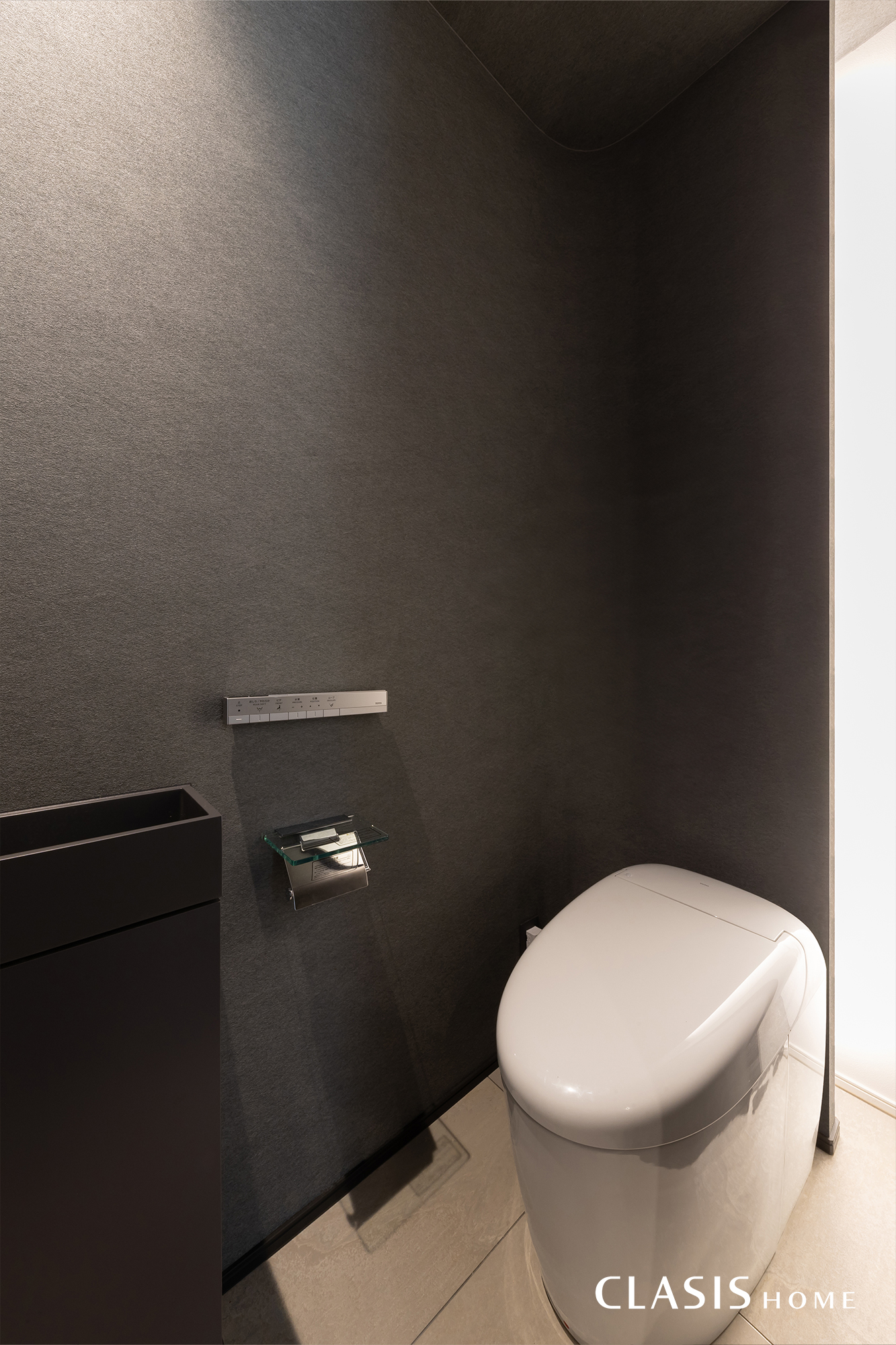 トイレは背面に収納をつくり、間接照明を仕込むことで生活感のない空間に。手洗いもブラックでシンプルなデザインのものをチョイスしました。
