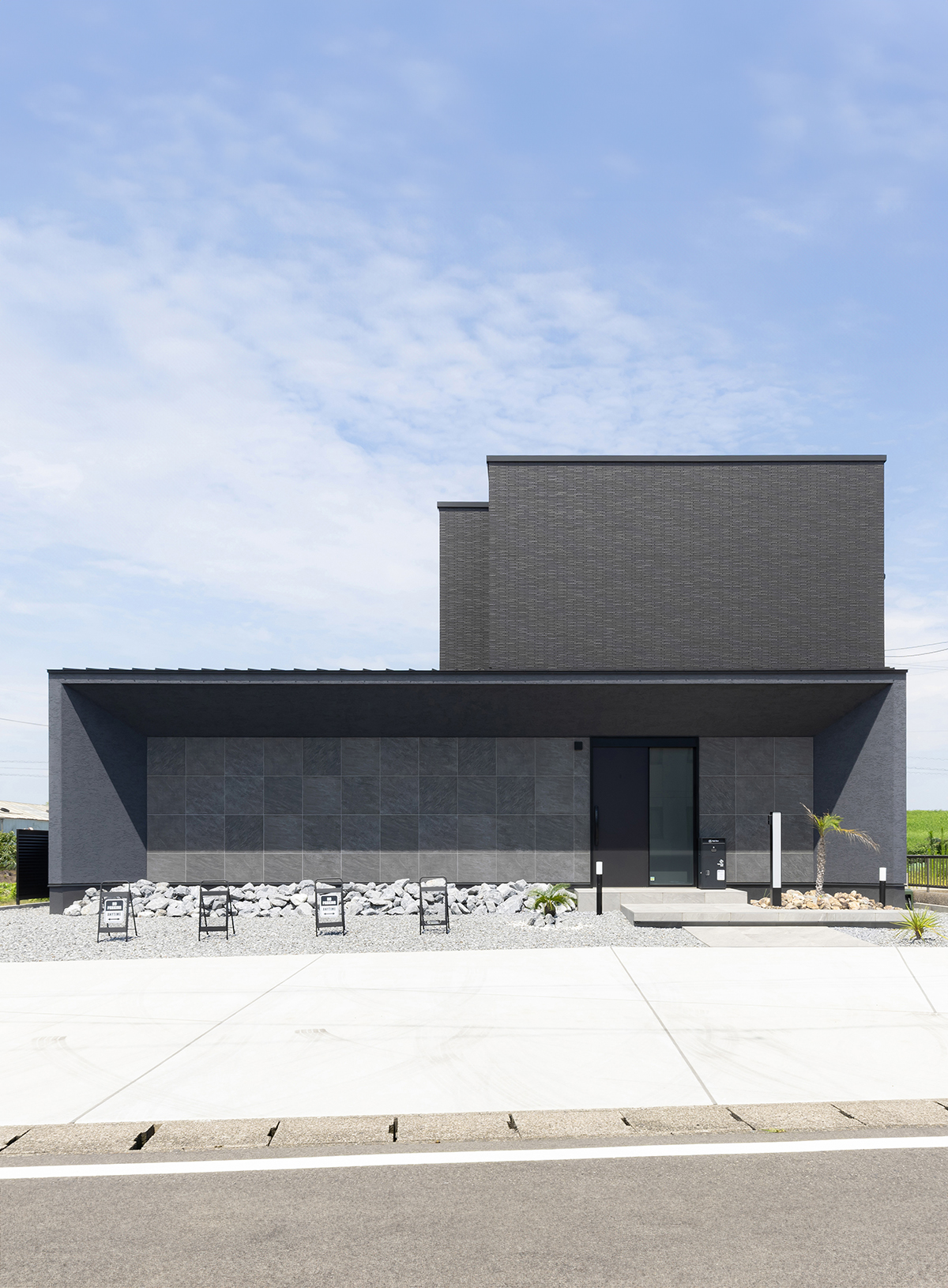 ブラックで統一したスタイリッシュな外観。塗り壁のワイドフレームを大判タイルを囲うように施しました。正面に窓を設けない閉じた印象のファサードは、静謐さを感じさせる佇まいです。