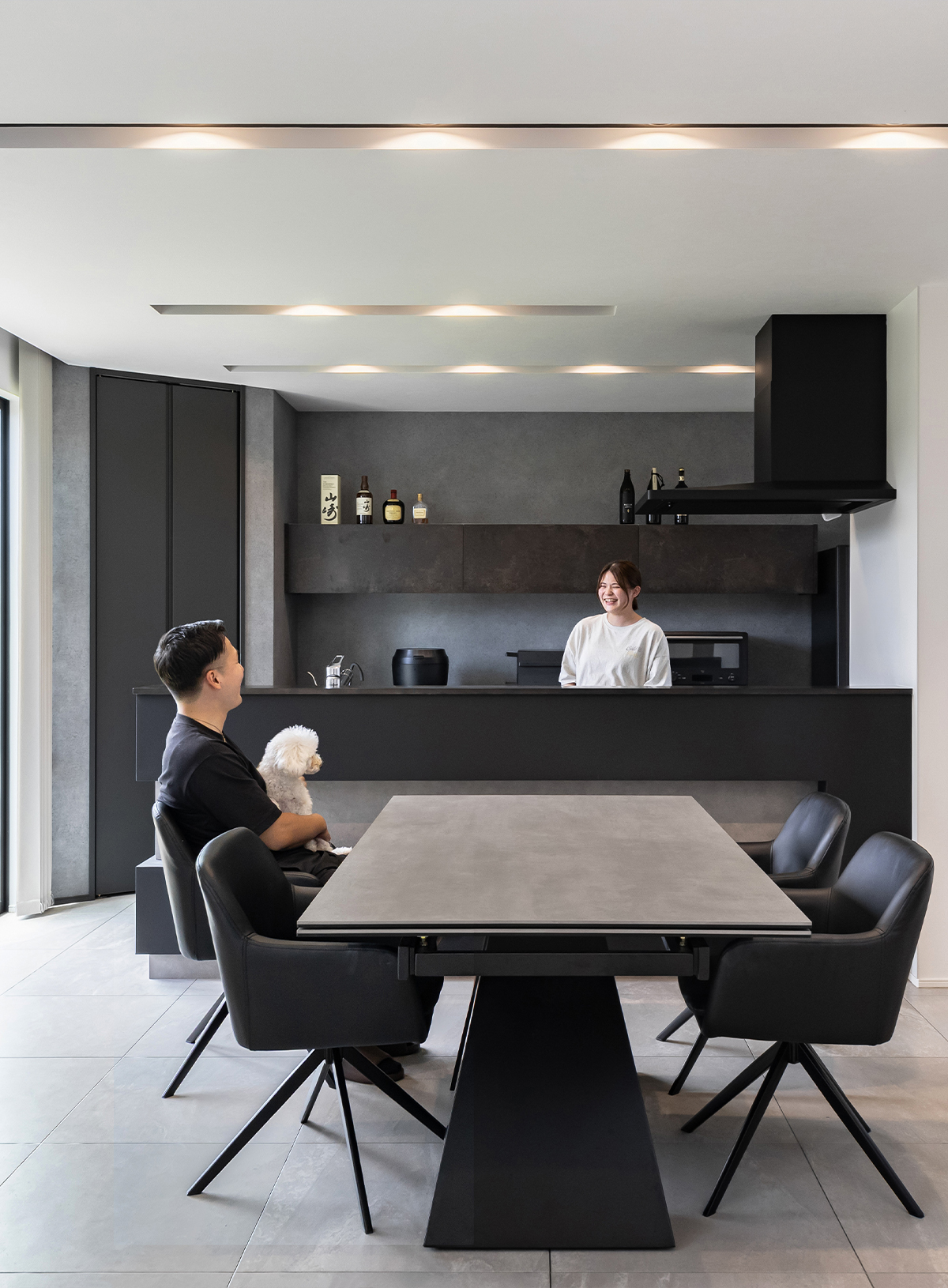 ダウンライトは折り上げた天井部分に隠すことにより、生活感を感じさせない仕様に。キッチン廻りは色合いを落とし、ブラックとグレーでまとめてシンプルで大人っぽいコーディネートにしています。