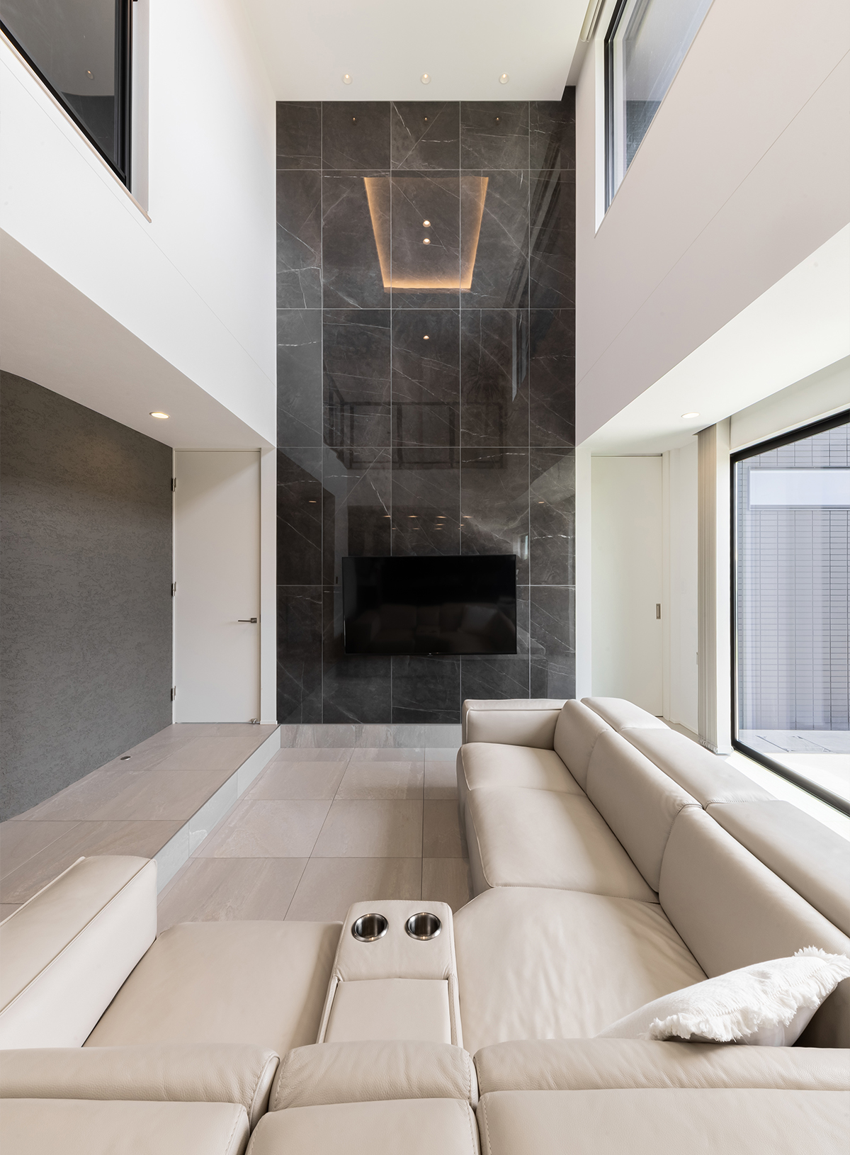 リビングのTV面には吹抜け全面に鏡面の大判タイルを貼り、ホテルのロビーのような空間としました。