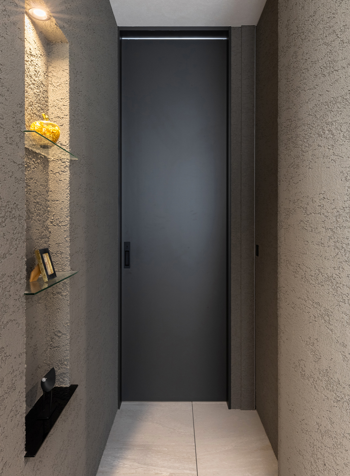 洞窟に入るような空間にしたいとのお施主様からのご要望を受け、ファミリークローゼットへ繋がる右手の扉を壁と同じ塗装を施し、隠し扉のように存在感を無くしました。塗り壁で囲われ、照明をニッチの中のみとした、特別な雰囲気のある空間を作りました。