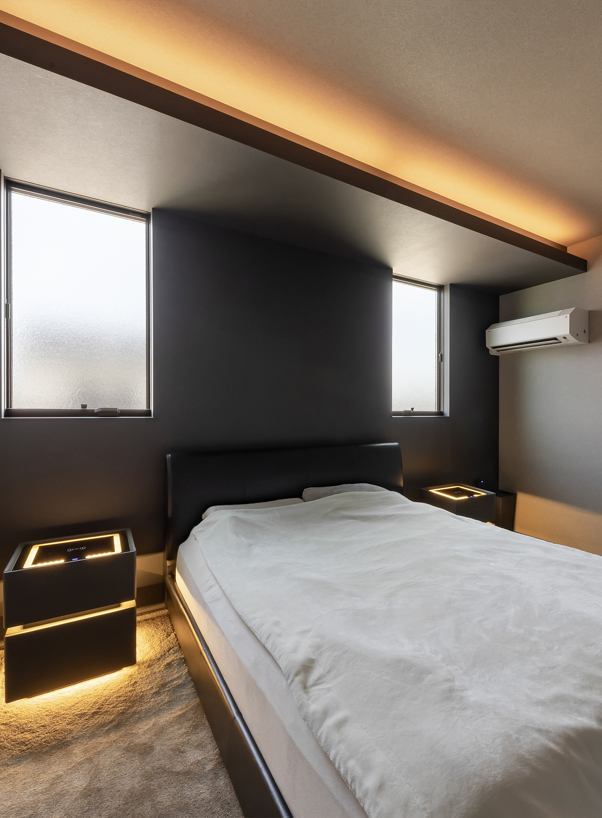 折下げ天井から間接照明の光が柔らかく注ぐシックな寝室。他の居室よりワントーン落とした色合いで落ち着いた印象に仕上げました。
