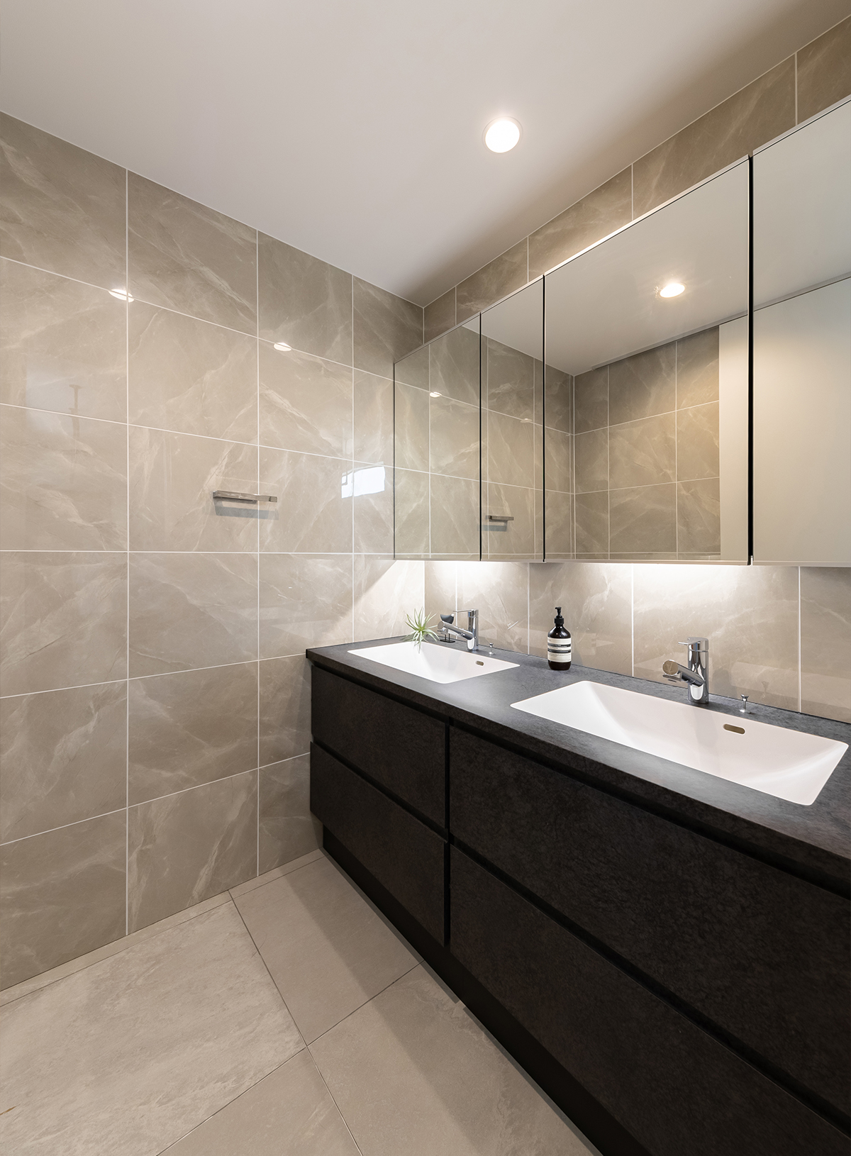 鏡面仕上げのタイルを壁面に貼り、海外ホテルのような高級感のある洗面室。大きな収納付きミラーが広く見せてくれます。