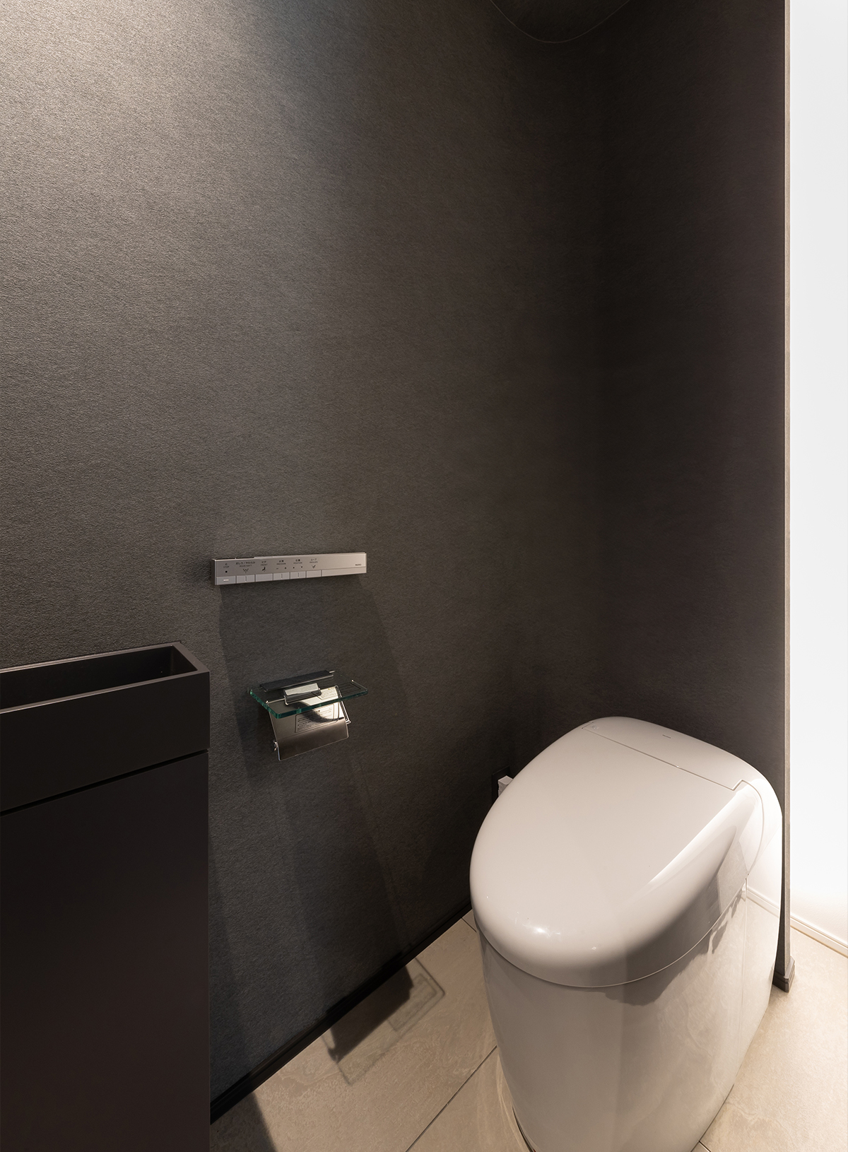 トイレは背面に収納をつくり、間接照明を仕込むことで生活感のない空間に。手洗いもブラックでシンプルなデザインのものをチョイスしました。