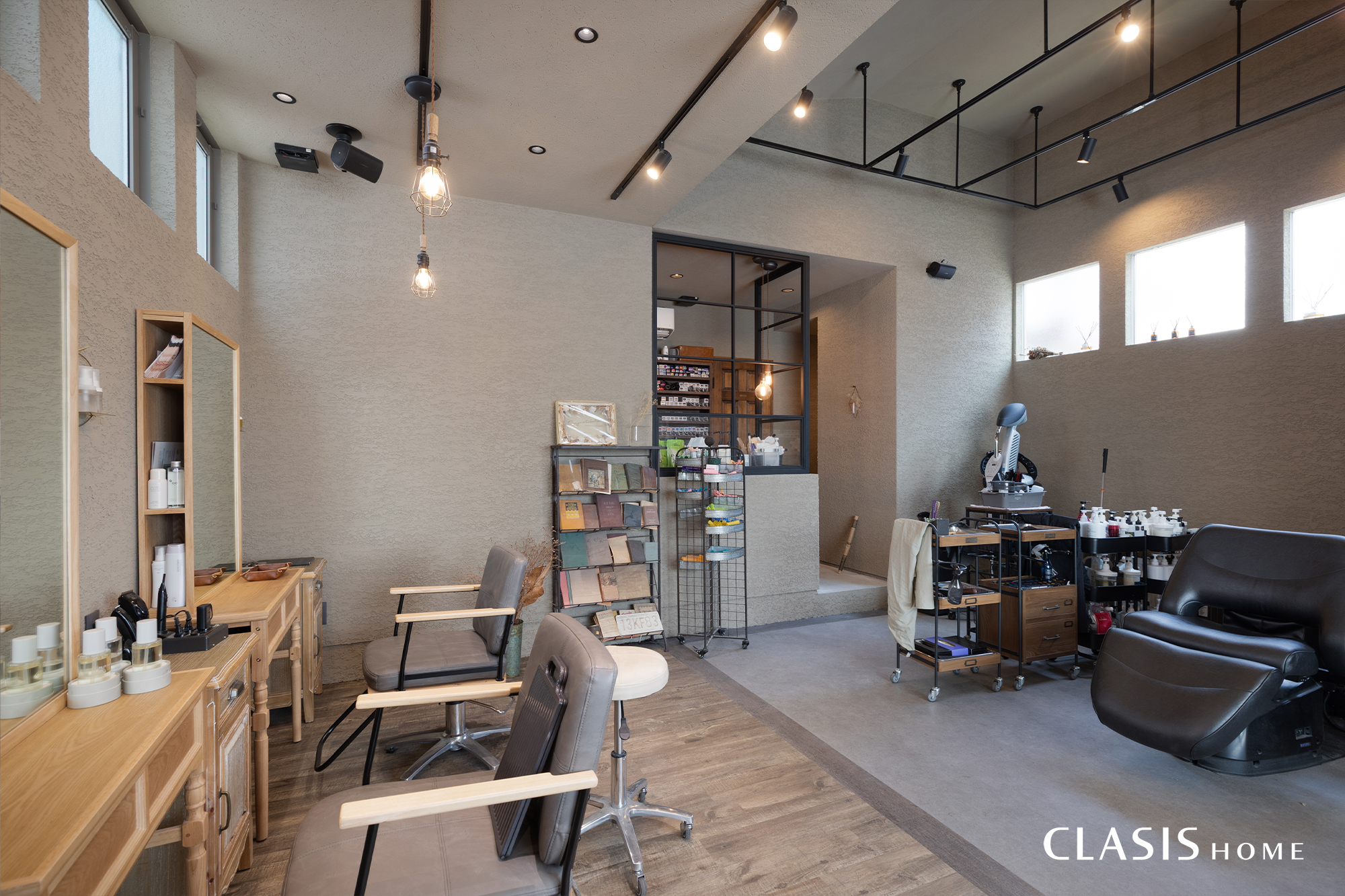 シャンプー台まわりにはコンクリート調のフロアタイルを採用し、引き締まったソリッドな雰囲気に仕上げました。勾配天井になっており、高さを活かした設計で開放的な空気感を演出しています。