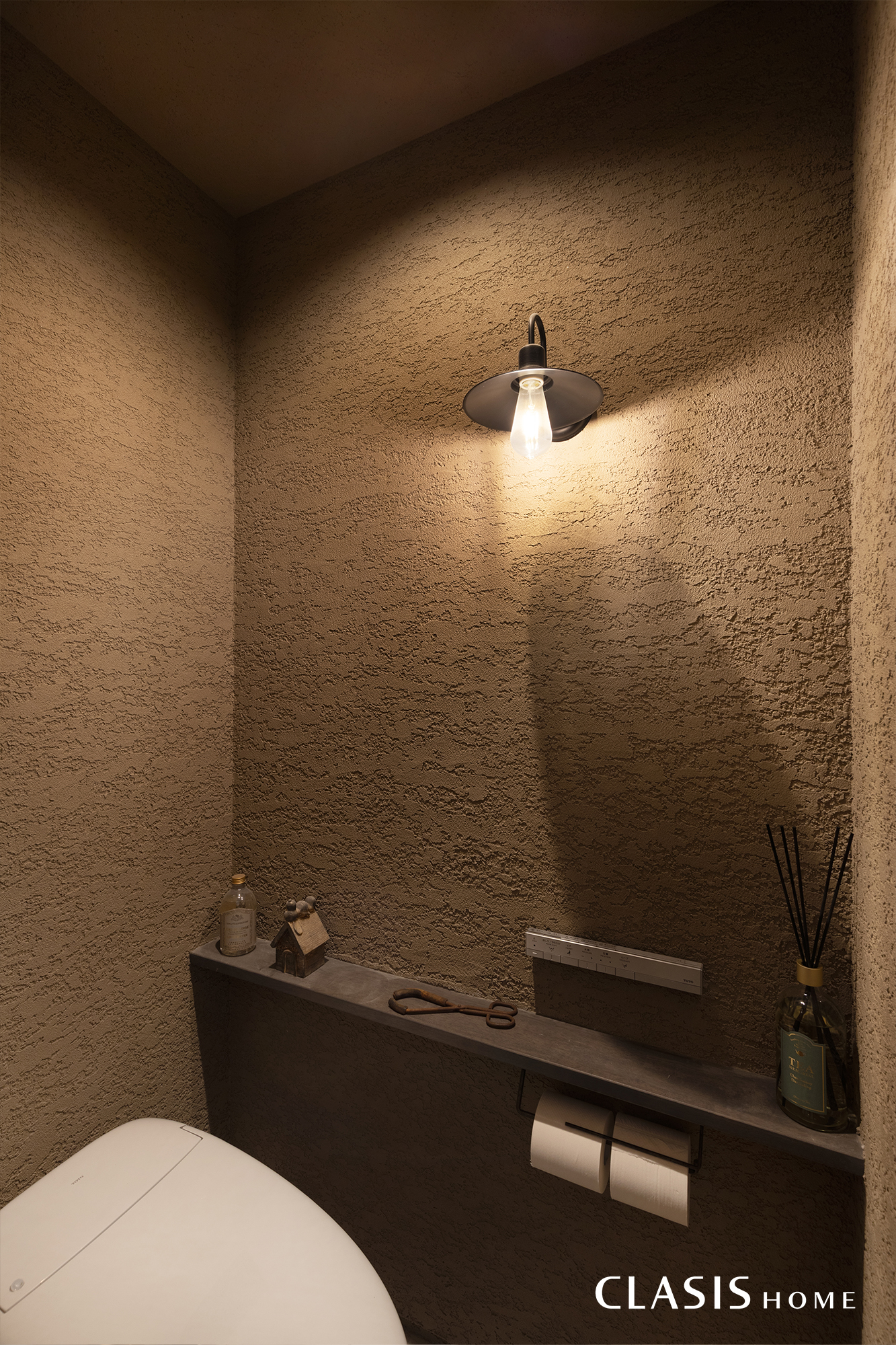 美容院内トイレ。塗り壁の質感がブラケットライトにより際立つ、ナチュラルで落ち着いた雰囲気にコーディネートしました。手洗いはレトロな雰囲気でまとめ、アクセントカラーのゴールドがほんのりとした華やぎを添えます。